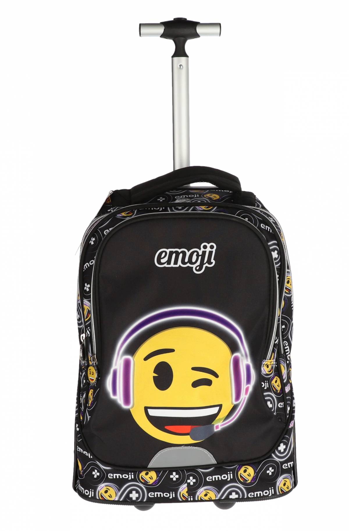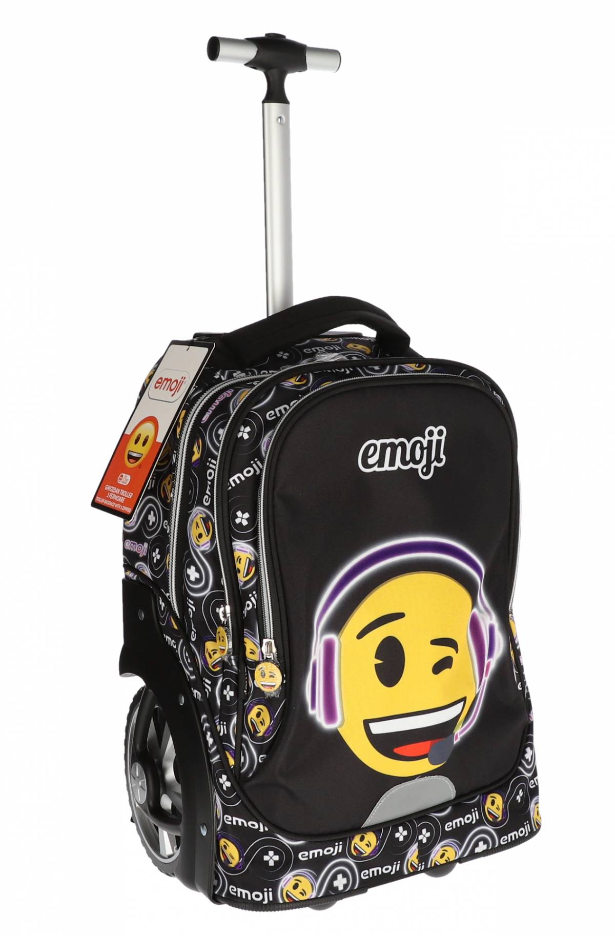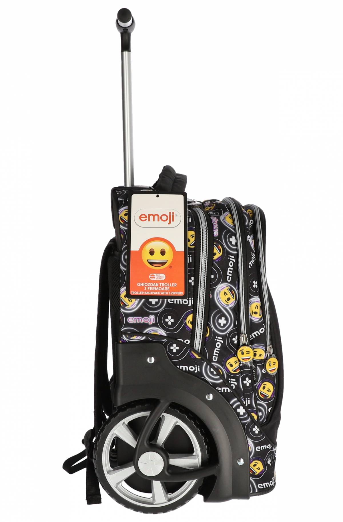Ghiozdan troller Emoji negru cu 3 compartimente și căști incluse, dimensiuni 50×34×26 cm, greutate 2,80 kg. Design modern cu imprimeu emoji, roți rezistente și mâner telescopic retractabil, ideal pentru școală și călătorii. Spațios și ergonomic, oferă organizare optimă.