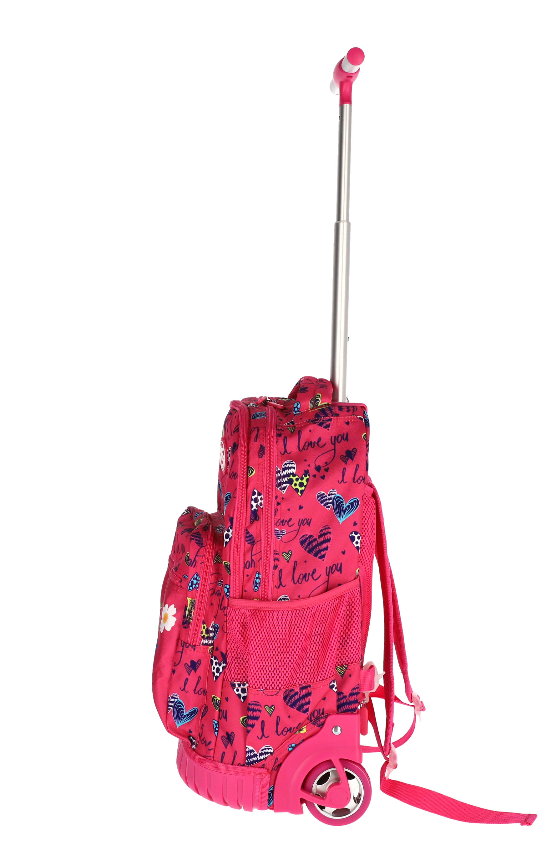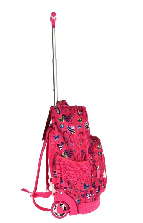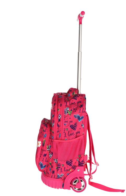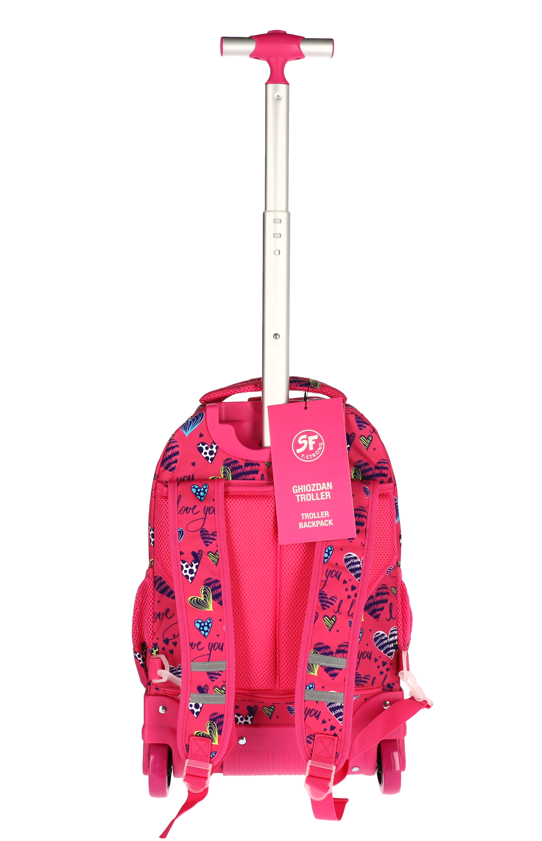 Ghiozdan troller SF T-STRONG cu 4 roti, dimensiuni 48x32x21cm și greutate 1.8kg, design Girl Power în nuanțe de roz. Rucsac școlar cu mâner telescopic retractabil, compartiment spațios și sistem de rulare fluid, ideal pentru transportul confortabil al rechizitelor. Fabricat din materiale rezistente.