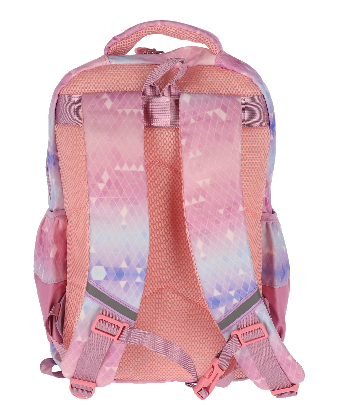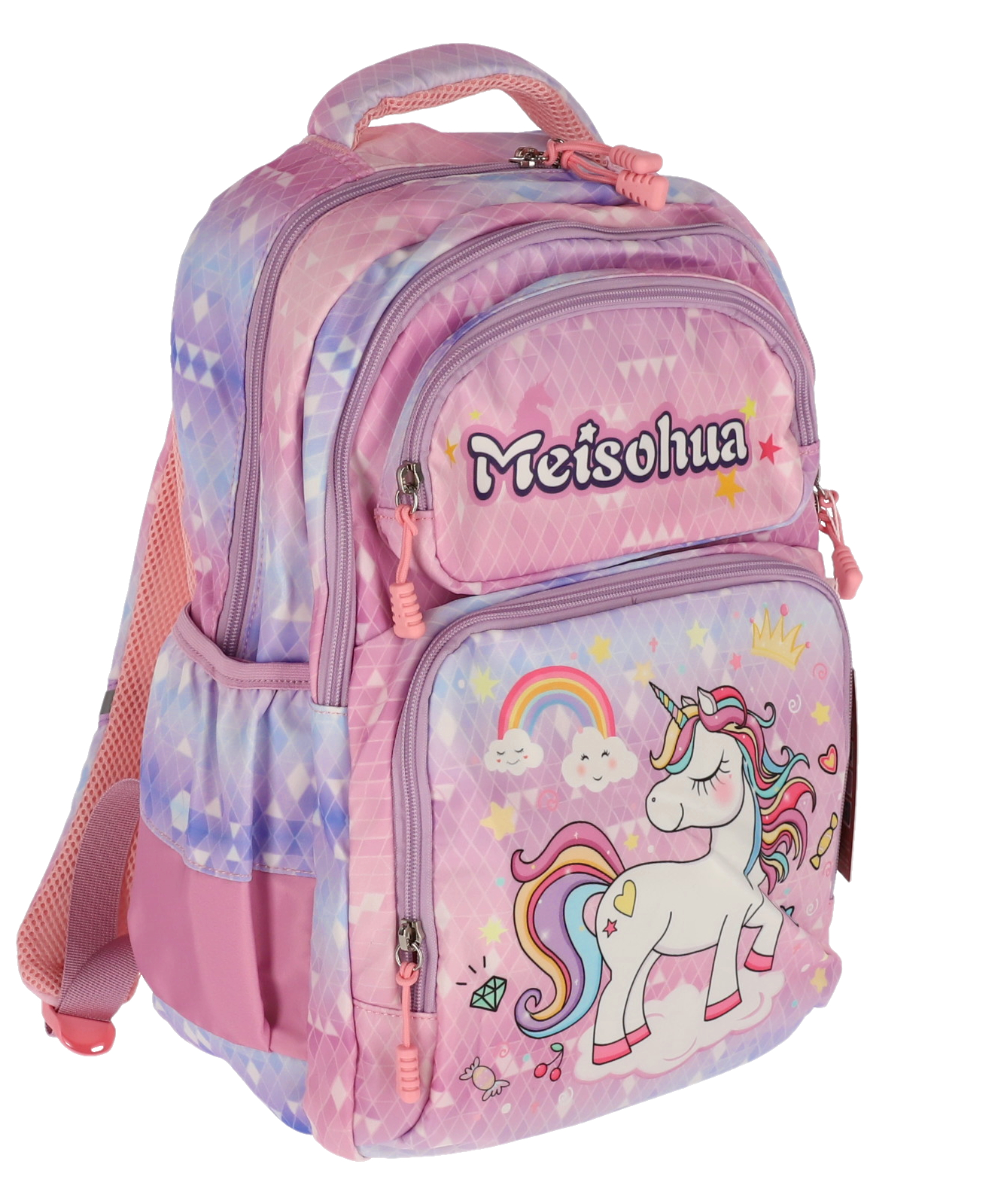 Ghiozdan școlar UNICORN cu design colorat în nuanțe de mov, albastru și alb, dimensiuni 39×29×13 cm, greutate 0.8 kg. Include compartimente spațioase pentru cărți și rechizite, bretele ajustabile pentru confort maxim, ideal pentru școală și activități zilnice.