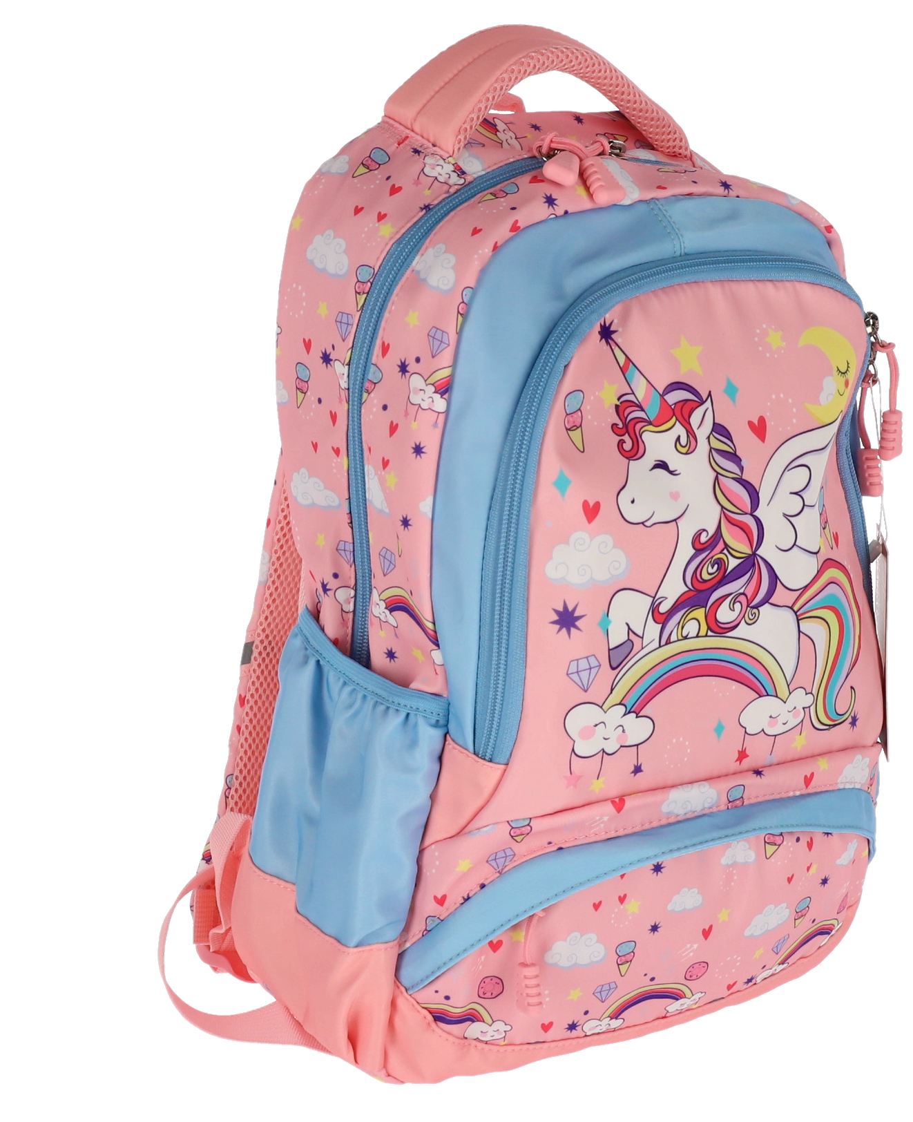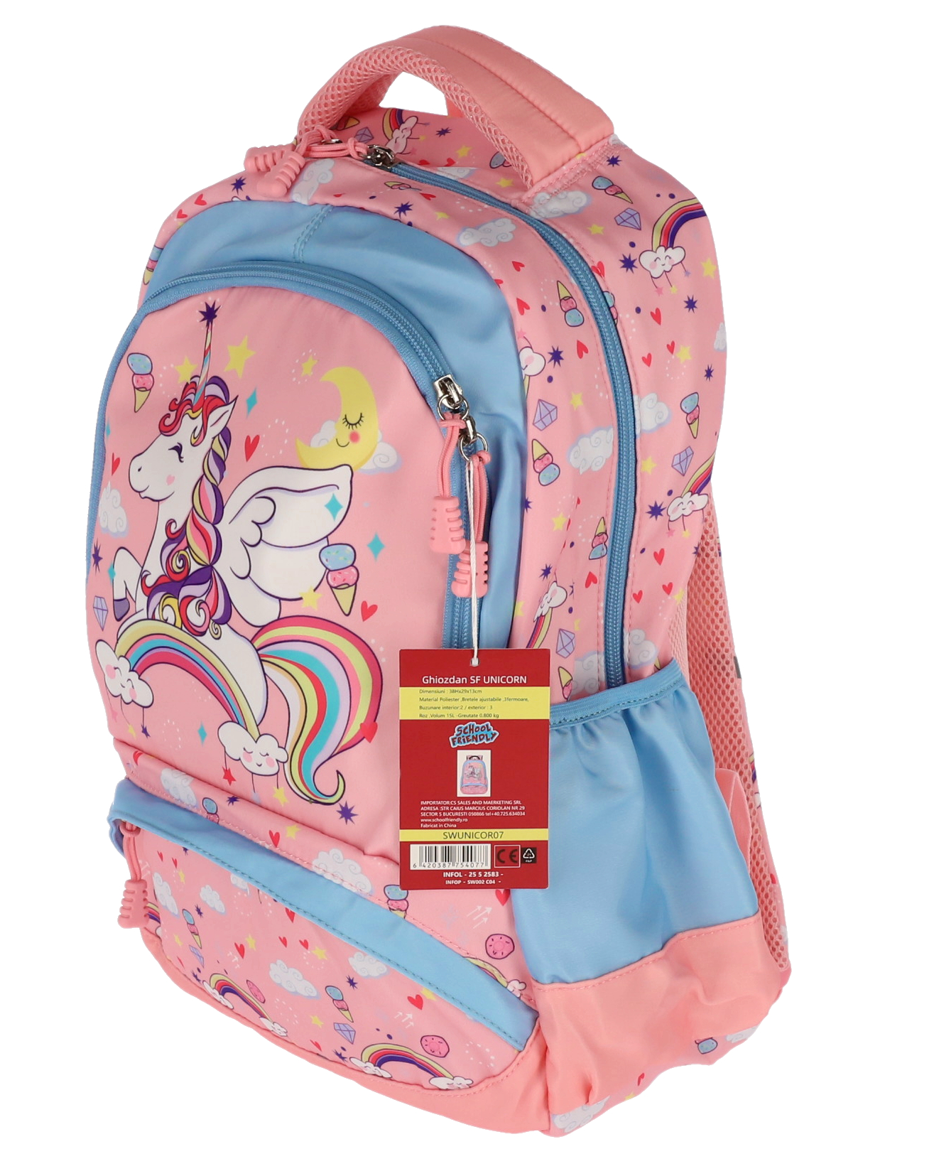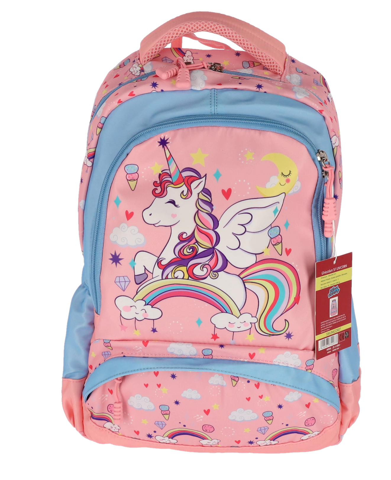 Ghiozdan școlar UNICORN cu design vesel în culoare roz, dimensiuni 39x29x13 cm și greutate de doar 0.8 kg. Perfect pentru copii, oferă spațiu generos de depozitare cu 4 compartimente funcționale, bretele ajustabile pentru confort maxim și materiale rezistente de calitate superioară.