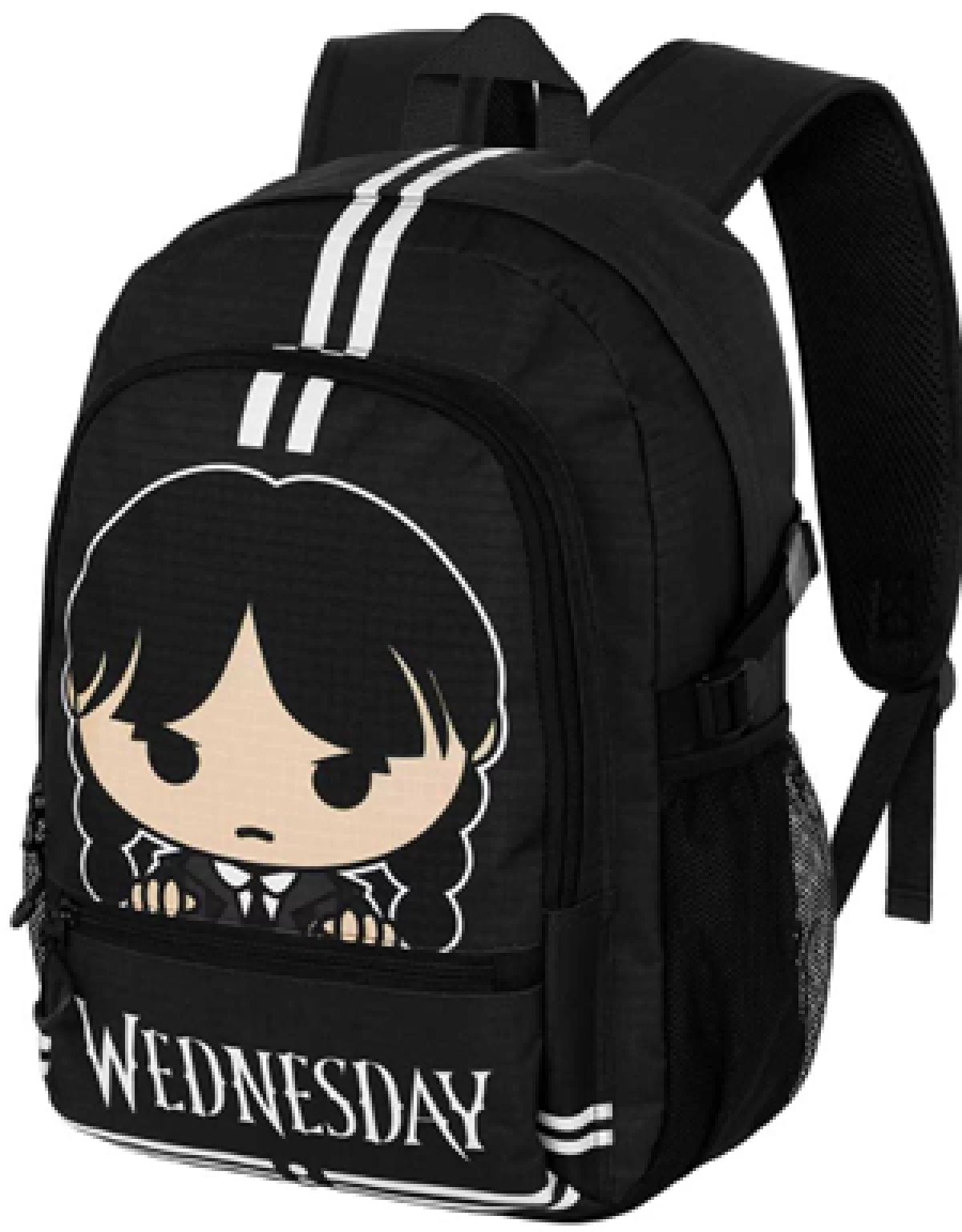Ghiozdan Wednesday Cute FAN Fight cu design negru iconic, bretele ajustabile matlasate și compartimente spațioase 44×31×18 cm. Rucsac școlar din material rezistent, cu imprimeu grafic al personajului preferat, buzunare laterale și fermoare durabile, perfect pentru fani.