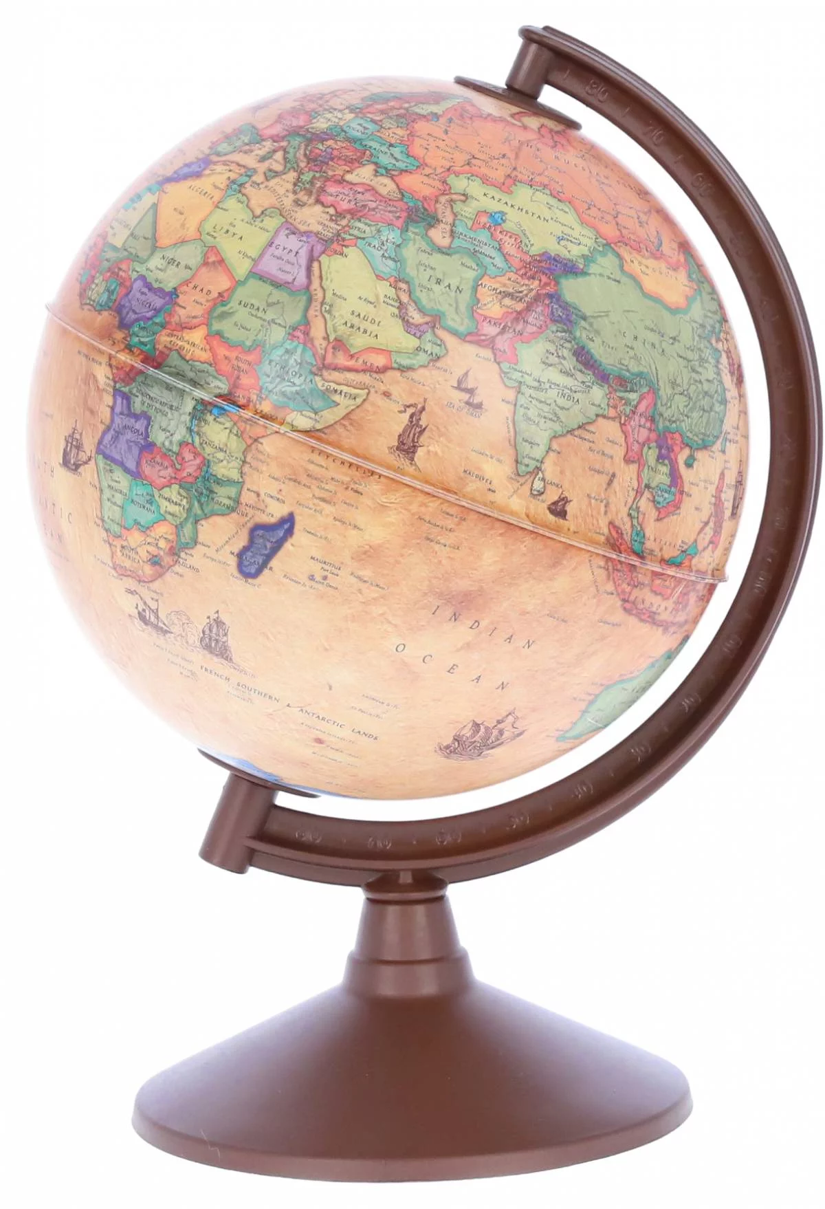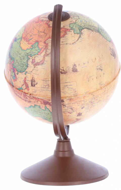Glob pământesc decorativ în stil antic cu diametru de 26 cm, montat pe suport maro elegant. Harta prezintă continente colorate în tonuri calde, cu detalii geografice și ilustrații maritime vintage, perfect pentru birou sau bibliotecă. Ideal ca obiect educațional și element decorativ de impact.
