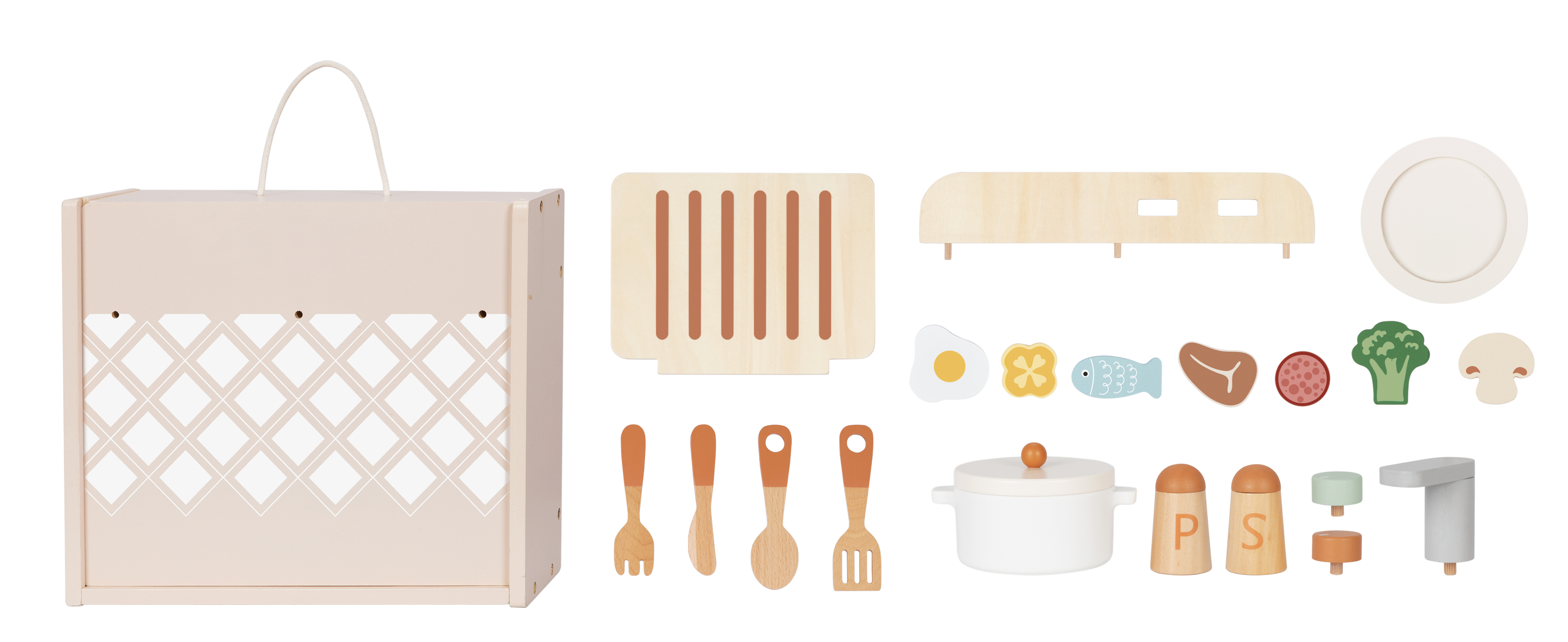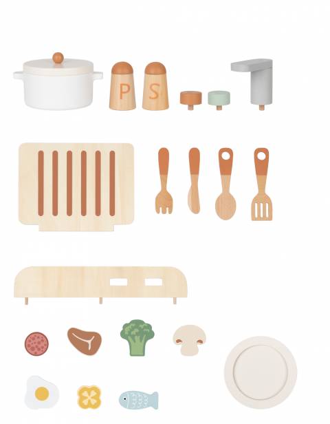 Kitchen Set este o bucatarie de jucarie din lemn, conceputa pentru a incuraja jocul de rol, creativitatea si dezvoltarea abilitatilor sociale ale copiilor. Setul include aragaz, chiuveta, rafturi, ustensile si accesorii alimentare, oferind o experienta completa de joaca.