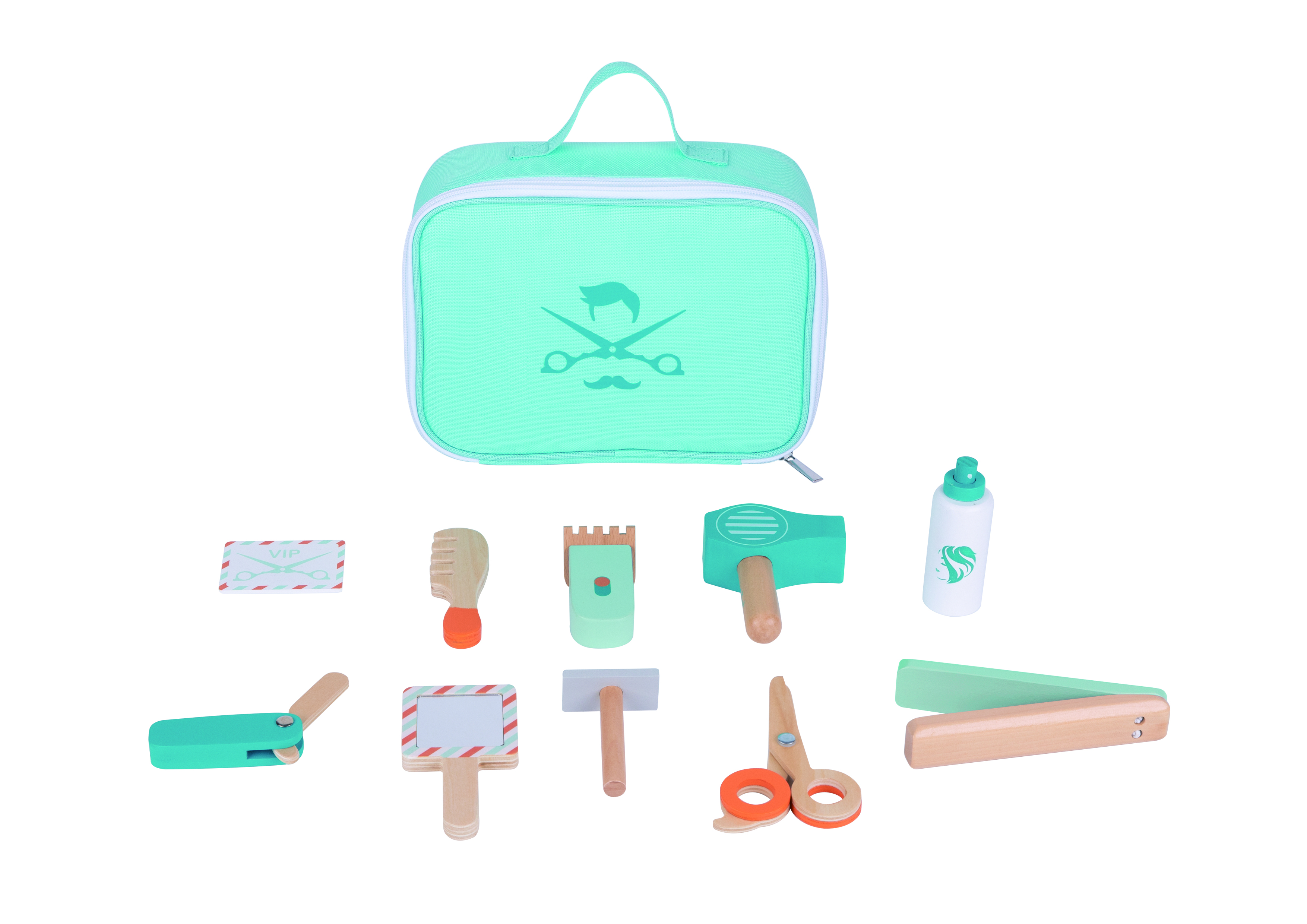 Little Hairdresser Play Set este un set de joaca creativ care le permite copiilor sa intre in rolul unui mic frizer sau coafor. Setul contine accesorii din lemn atent finisate si o gentuta practica pentru depozitare si transport, incurajand jocul de rol si imaginatia.
