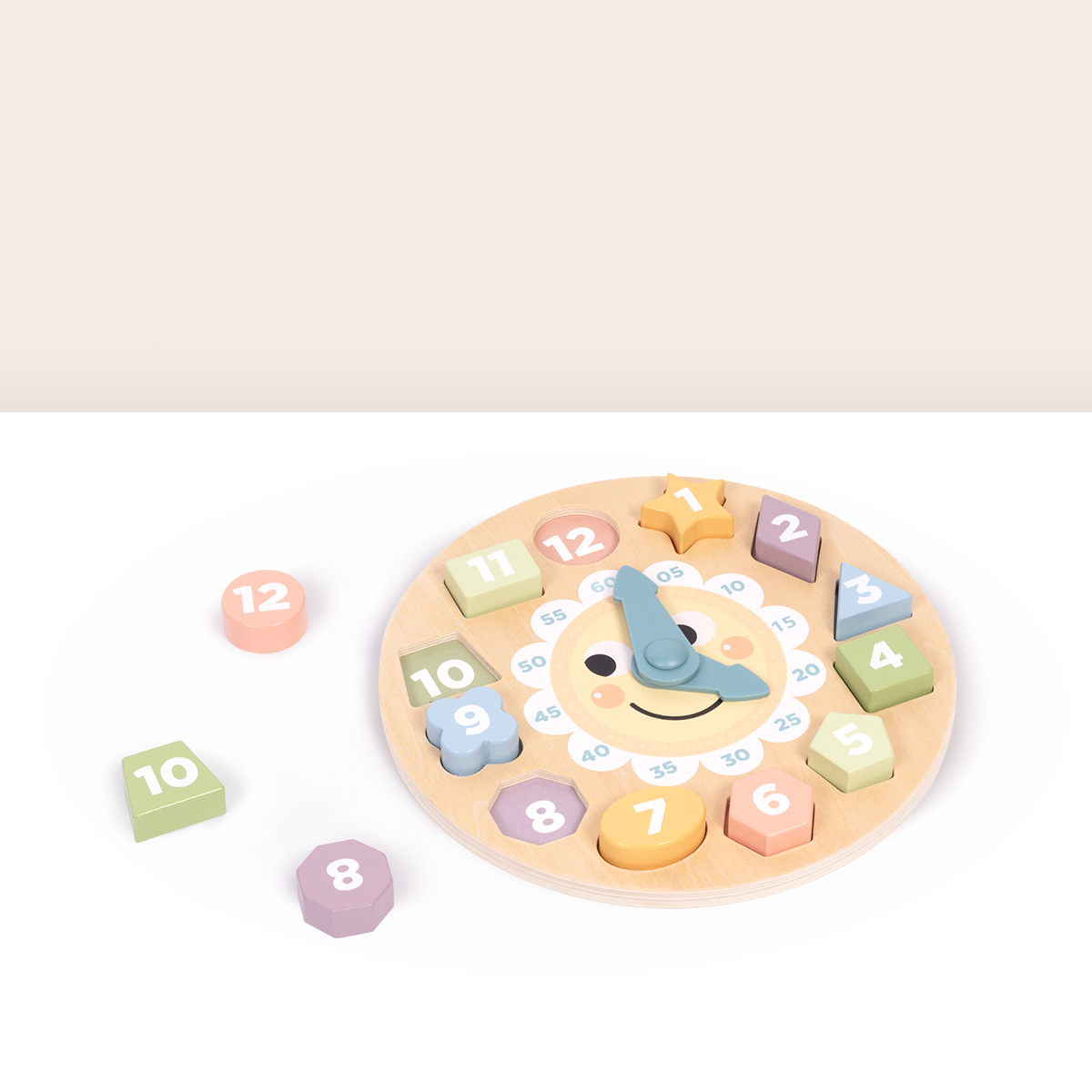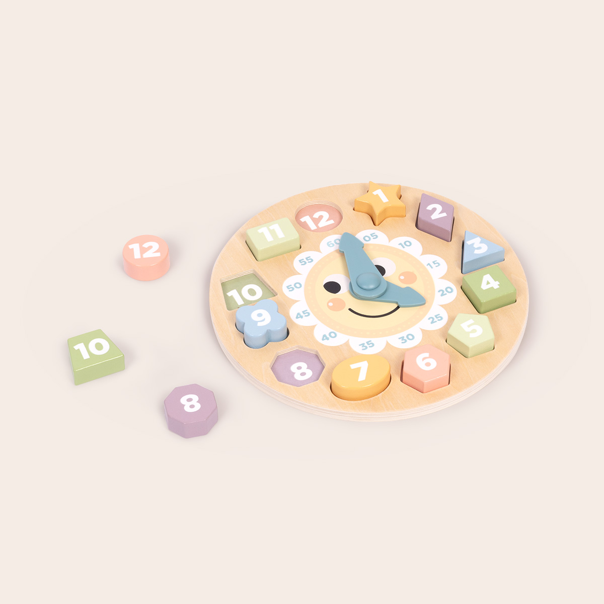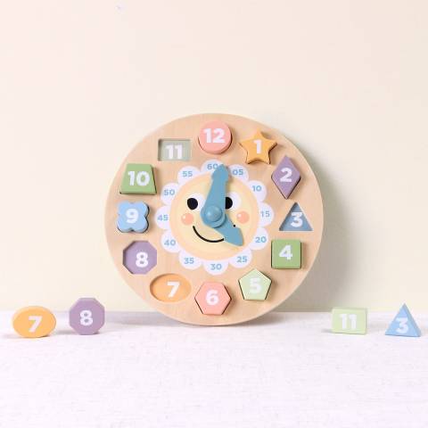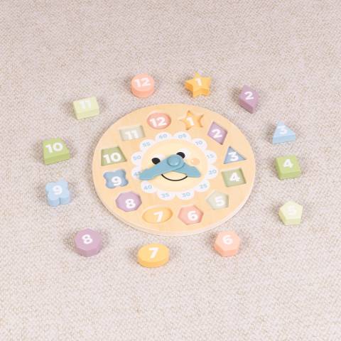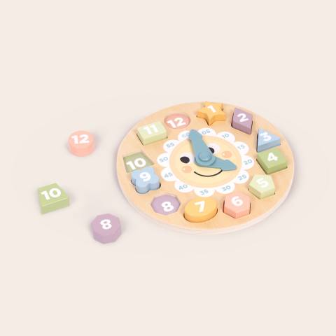 Calendarul are forma unui ceas colorat, cu cifre mari, vizibile, si limbi mobile, care pot fi rotite manual. Designul prietenos si culorile pastelate ii incurajeaza pe cei mici sa interactioneze si sa invete prin joaca.