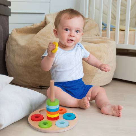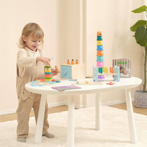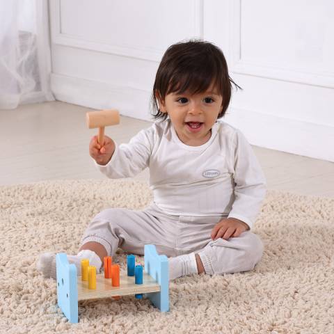 Toate piesele sunt realizate din lemn natural, cu vopsele pe baza de apa, non-toxice, fiind sigure pentru utilizare zilnica. Setul incurajeaza invatarea prin joaca si explorare independenta, conform principiilor Montessori.