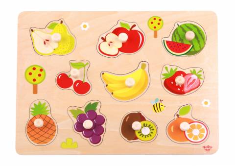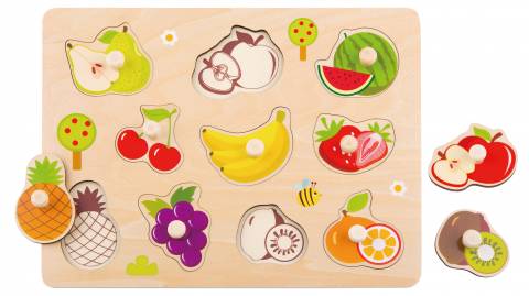Acest puzzle educativ cu fructe din lemn este conceput pentru a ajuta copiii sa recunoasca diferite tipuri de fructe, culori si forme intr-un mod distractiv si interactiv. Fiecare piesa este prevazuta cu buton din lemn, facilitand prinderea si potrivirea corecta in locasul corespunzator.