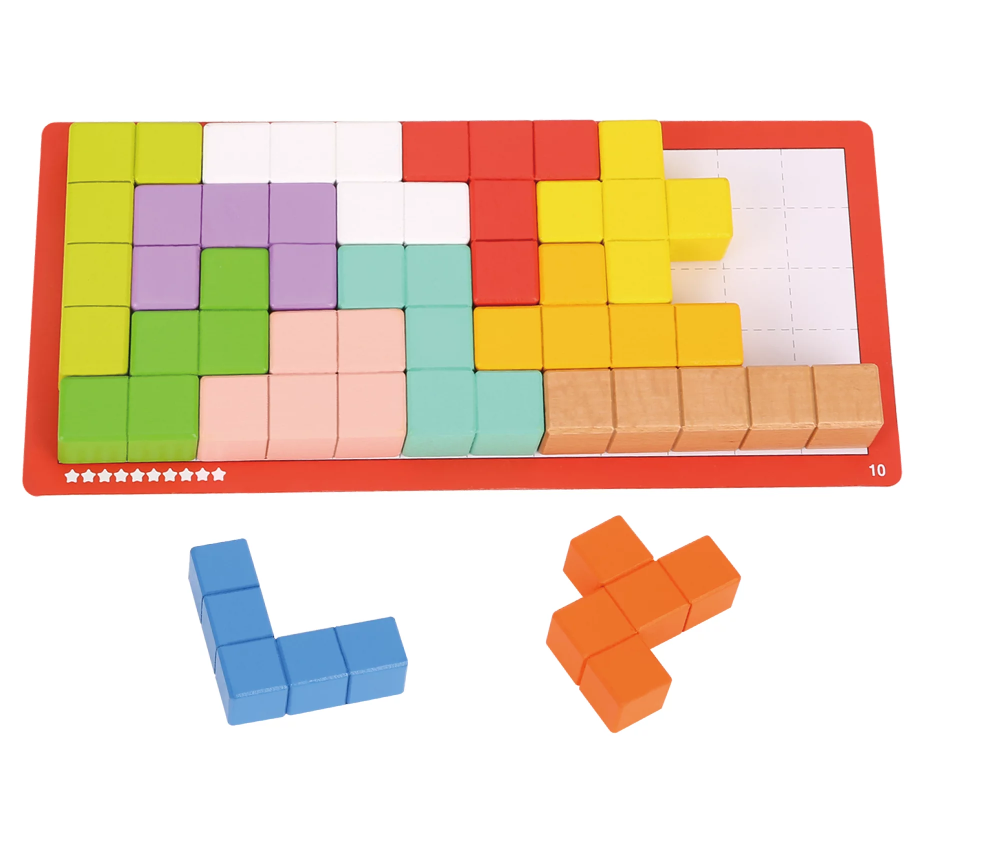 Acest puzzle logic cu cuburi din lemn este un joc educativ conceput pentru a dezvolta gandirea spatiala, logica si creativitatea copiilor. Setul contine cuburi colorate care pot fi aranjate pe tabla de joc pentru a recrea modele sau pentru a construi propriile forme.