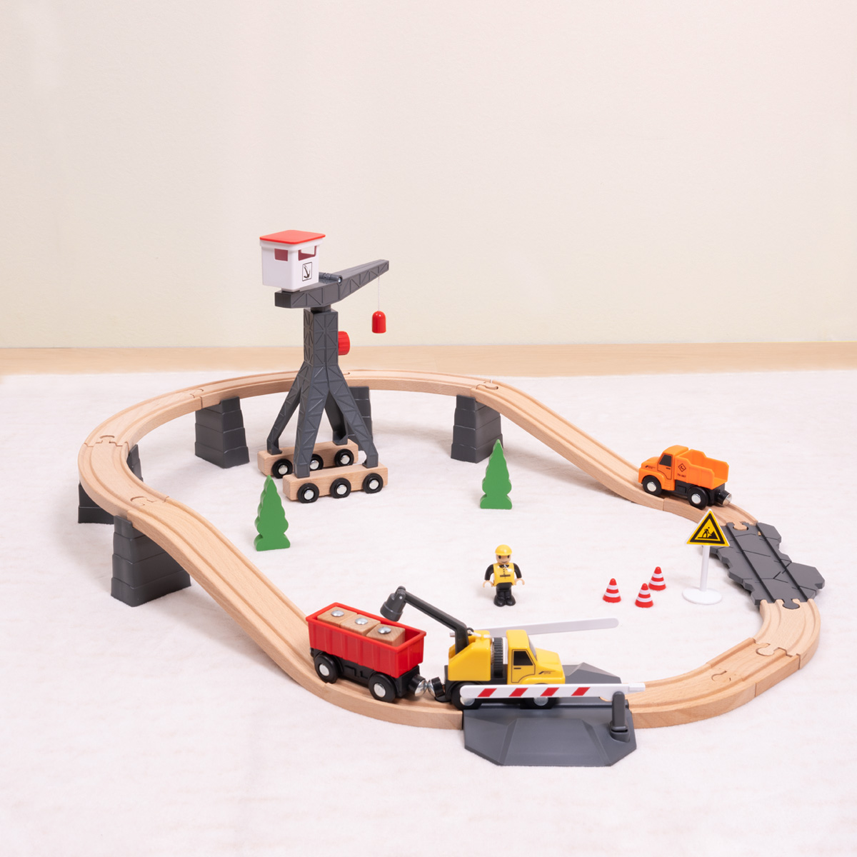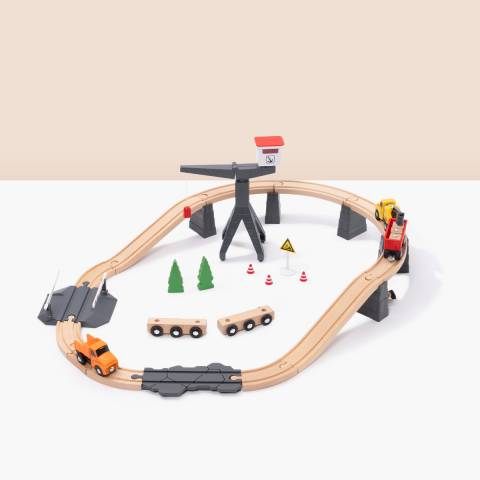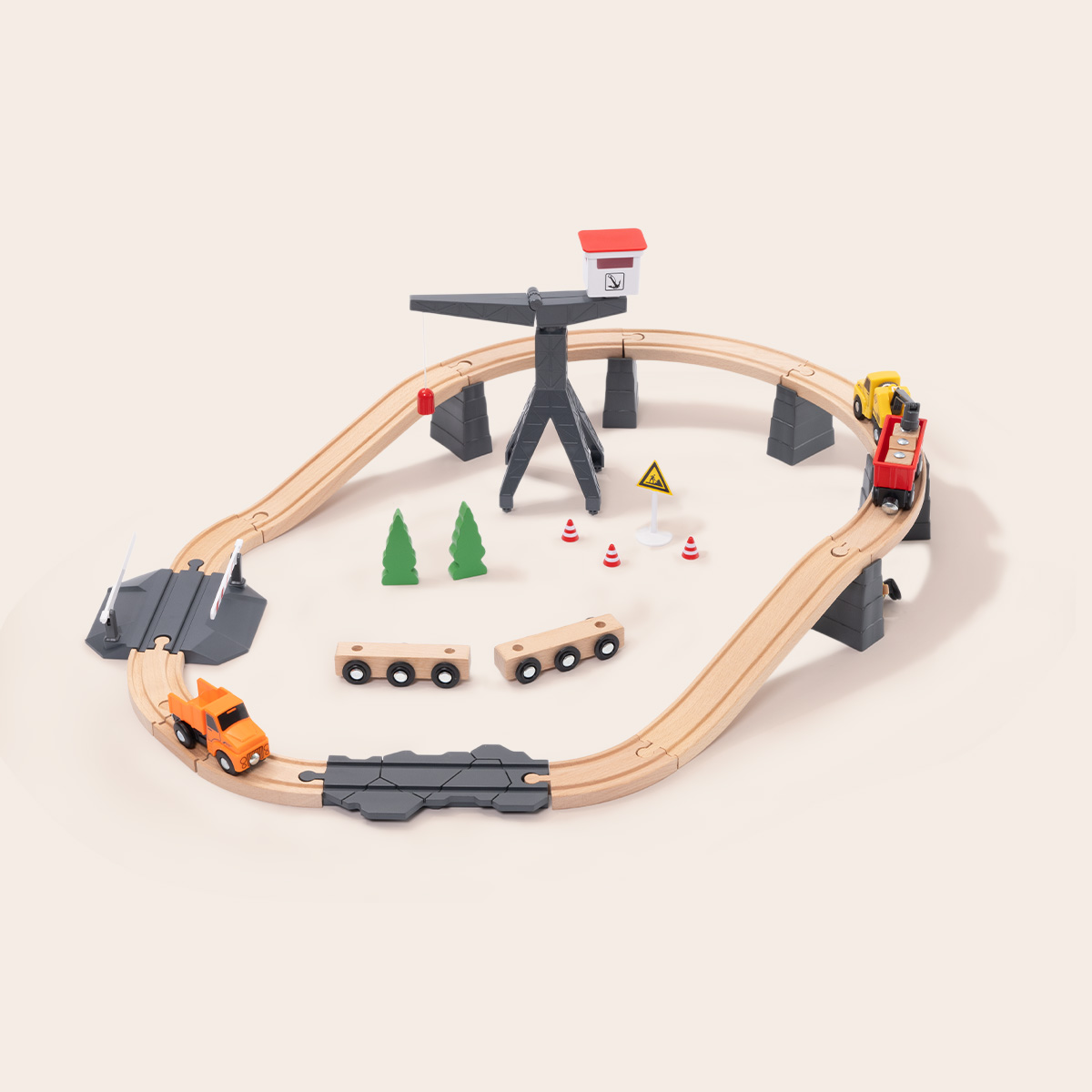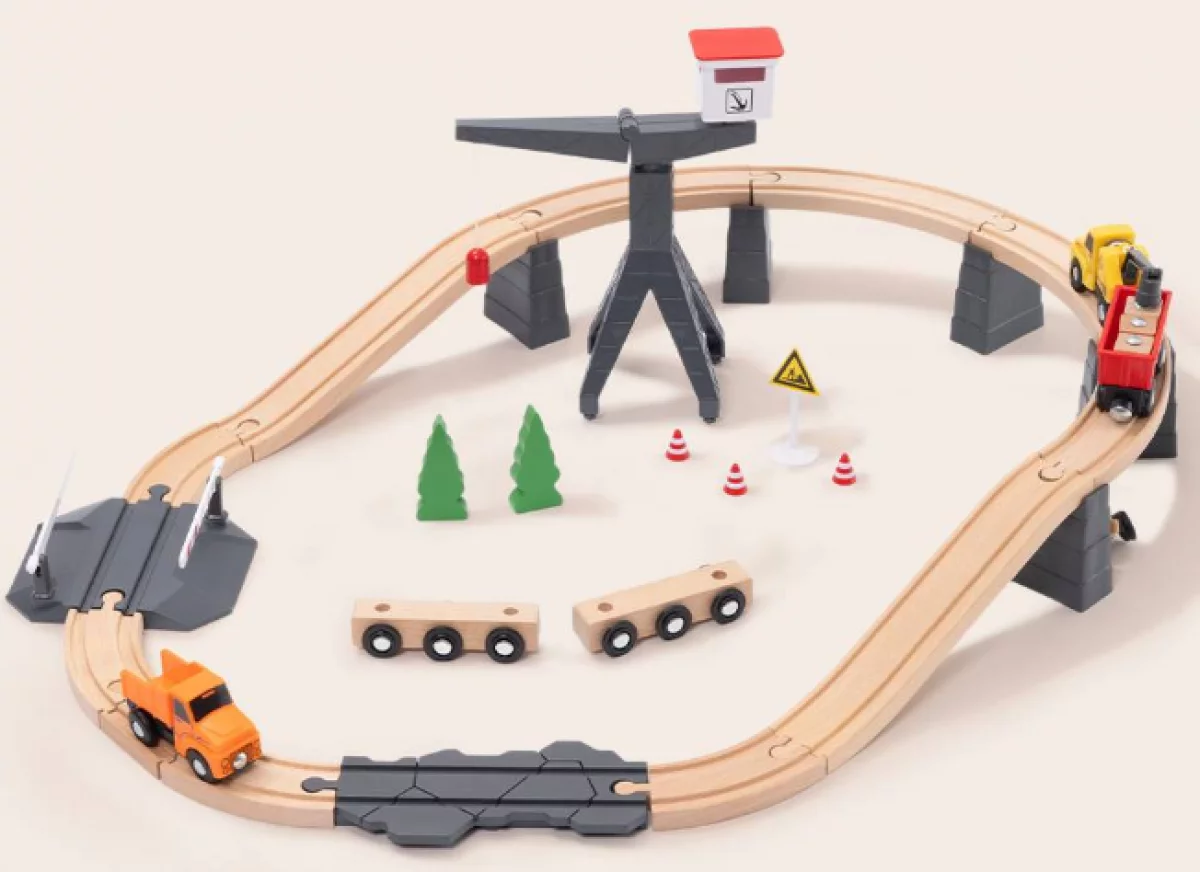 Set complet de tren din lemn Montessori pentru copii, incluzând șine circulare modulare, pod suspendat, vagoane colorate, accesorii decorative precum copăcei și indicatoare de siguranță. Jucărie educativă ideală pentru dezvoltarea creativității și a abilităților motorii fine.