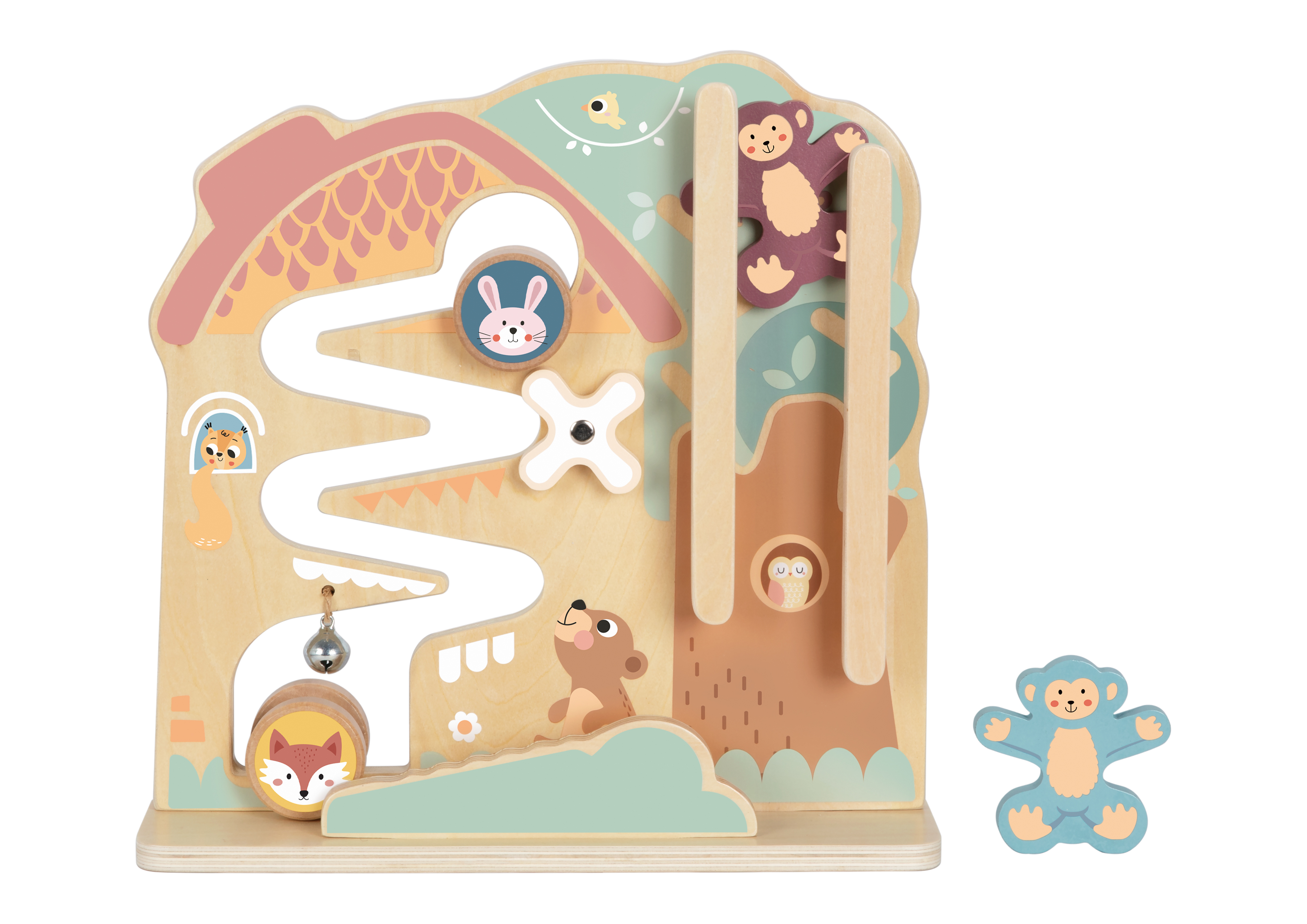 Jocul ajuta copiii sa inteleaga relatia cauza–efect, sa isi dezvolte coordonarea mana–ochi si sa isi imbunatateasca abilitatile motorii fine. Elementele sunt realizate din lemn de calitate, cu margini rotunjite si vopsea pe baza de apa, non-toxica.
