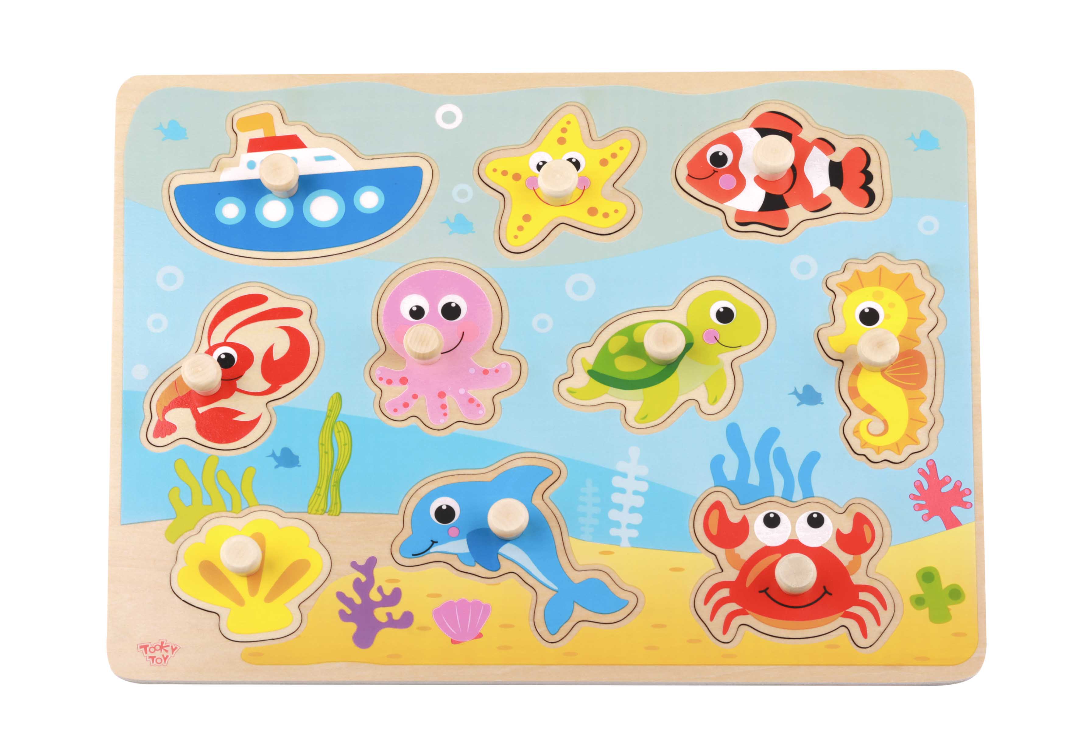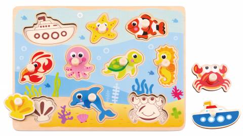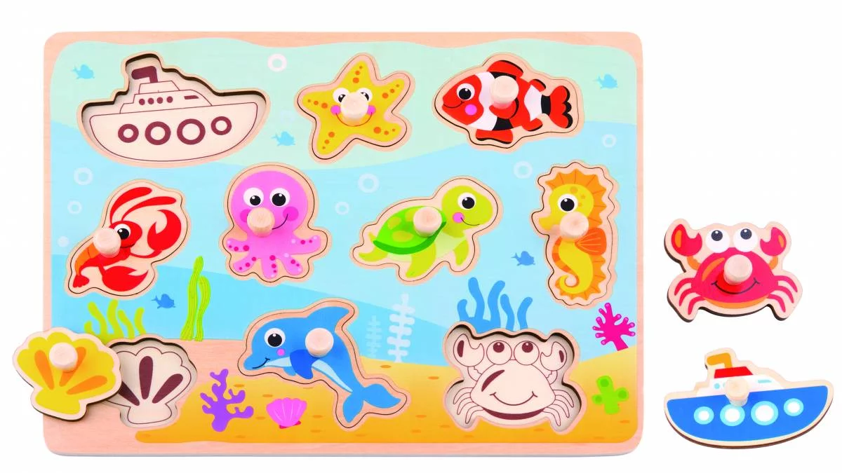Fiecare piesa reprezinta un animal marin sau un obiect specific mediului acvatic, contribuind la dezvoltarea motricitatii fine, coordonarii mana–ochi si recunoasterii formelor. Puzzle-ul este realizat din lemn natural, cu margini rotunjite si vopsele non-toxice, fiind sigur pentru utilizarea zilnica.