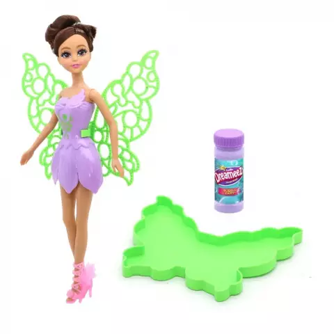 Aceasta papusa Dreameez devine si mai dulce cu aripile sale care fac bule de sapun! Tot ce trebuie sa faci este sa torni solutia pentru bule in tava in forma de fluture, apoi sa introduci aripile papusii in solutie. Misca papusa si urmareste cum bulele magice se formeaza, purtandu-te catre urmatoarea aventura! Pachetul contine: - 1x papusa cu aripi de zana blue; - 1x sticluta cu solutie; - 1x forma de fluture.