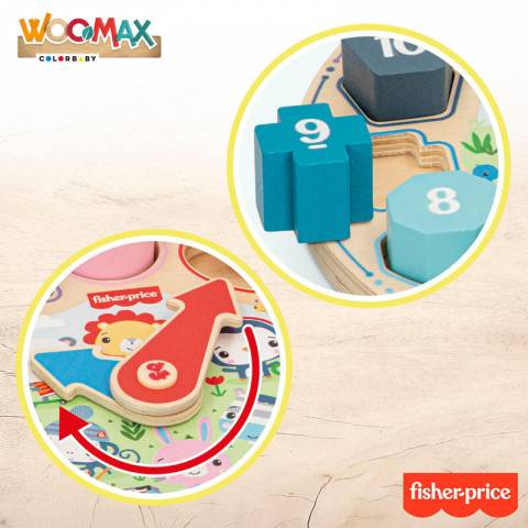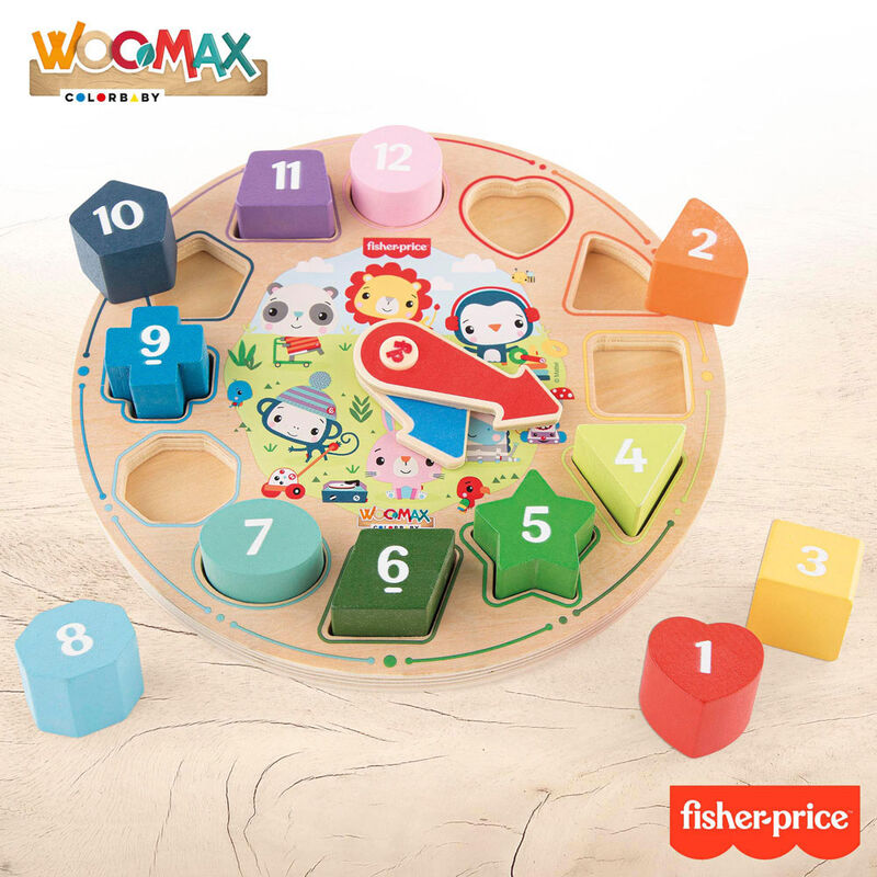 Ceas educațional din lemn cu 12 piese colorate și forme geometrice, perfect pentru învățarea numerelor, culorilor și orelor. Jucărie interactivă cu design vesel și ilustrații cu animale, ideală pentru dezvoltarea abilităților motorii și cognitive ale copiilor mici.
