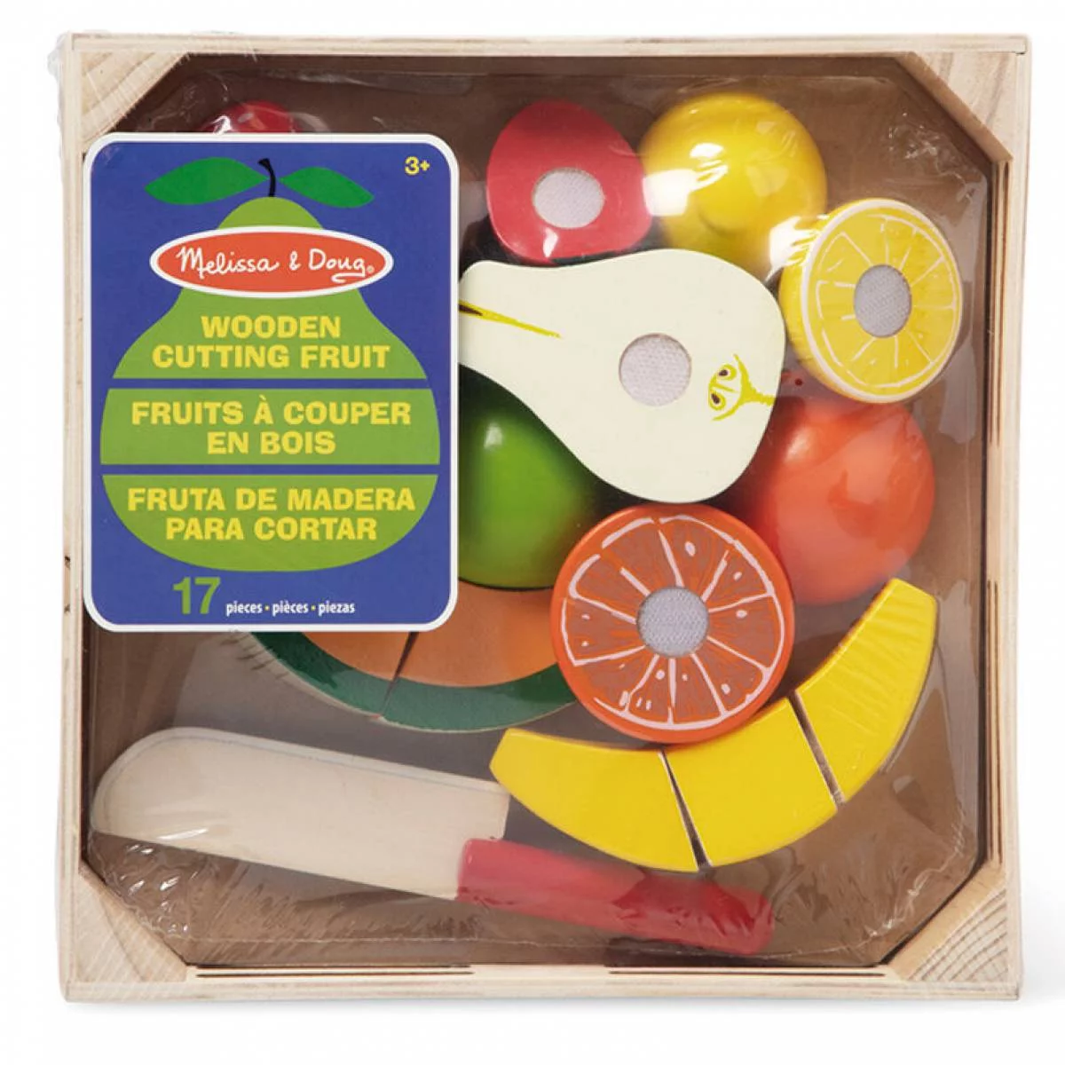Set educațional din lemn cu 17 piese colorate, incluzând fructe realiste care se taie cu cuțit de jucărie și se unesc prin scratch. Jucăria dezvoltă abilitățile motorii fine și coordonarea mână-ochi la copii, oferind ore de joacă imaginativă în bucătăria de jucărie cu măr, banană, portocală, lămâie, pară și pepene.