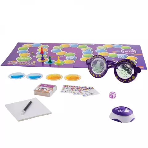 Asigura-te ca echipa ta ajunge prima la Finish. Jucatorii deseneaza pe rand un cuvant de pe cartonasele din pachet. Daca echipa ghiceste, pionul lor avanseaza spre Finish. Daca nu, pionul ramane pe loc. Dar nu este atat de simplu! Jucatorul al carui rand este sa deseneze trebuie sa poarte ochelarii cu lentile care distorsioneaza vederea. PREGATIREA JOCULUI: - Puneti tabla de joc in mijlocul mesei - Puneti ochelarii si lentilele langa tabla de joc; - Echipele se asaza in jurul tablei de joc; - Fiecare echipa alege cate un pion; - Asezati pionii tuturor echipelor in casuta Start. REGULI DE JOC: Echipa care are cel mai tanar jucator incepe si inmaneaza cronometrul unei echipe adverse. Echipa care este la rand stabileste ce jucator va desena primul, da cu zarul si isi muta pionul un numar de casute corespunzator numarului de pe zar. Culoarea casutei pe care aterizeaza pionul stabileste ce provocare va desena jucatorul si ce lentile va folosi in ochelari. De exemplu, daca pionul tau aterizeaza pe o casuta verde, trebuie sa porti lentilele verzi si sa desenezi provocarea marcata cu verde pe cartonas. Jucatorul care deseneaza trage un cartonas din teanc si anunta cu voce tare categoria (obiecte, timp liber, locuri), citeste in gand provocarea de desenat, apoi anunta cu voce tare timpul alocat. Jucatorul pune cartonasul cu fata in jos pe masa, asa incat coechipierii lui sa nu poata vedea provocarea, si isi pune ochelarii. Echipa adversa care are cronometrul anunta startul si incepe jocul. Jucatorul aflat la rand trebuie sa deseneze pe carnetelul pentru desen cuvantul sau expresia intr-un timp cat mai scurt, iar echipa lui trebuie sa ghiceasca inainte sa expire timpul. CINE CASTIGA: Echipele continua pe rand si avanseaza pe tabla de joc. Prima echipa care ajunge la Finish castiga. Nu este nevoie sa dai cu zarul numarul exact de casute pe care le mai are echipa ta pana la Finish ca sa castigi. Pachetul contine: - 1x tabla de joc - 4x pioni; - 1x pereche de ochelari - 1x set de lentile verzi/nivel usor; - 1x set de lentile galbene/nivel mediu; - 1 set de lentile albastre/nivel greu; - 1x zar (si foaie cu stickere) - 1x cronometru; - 1x carnetel pentru desen; - 1x creion.