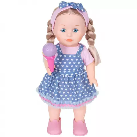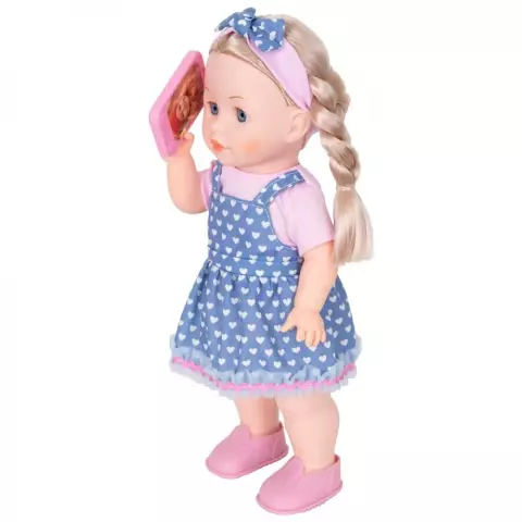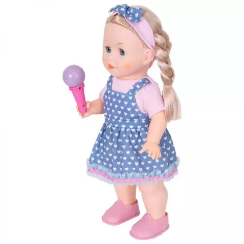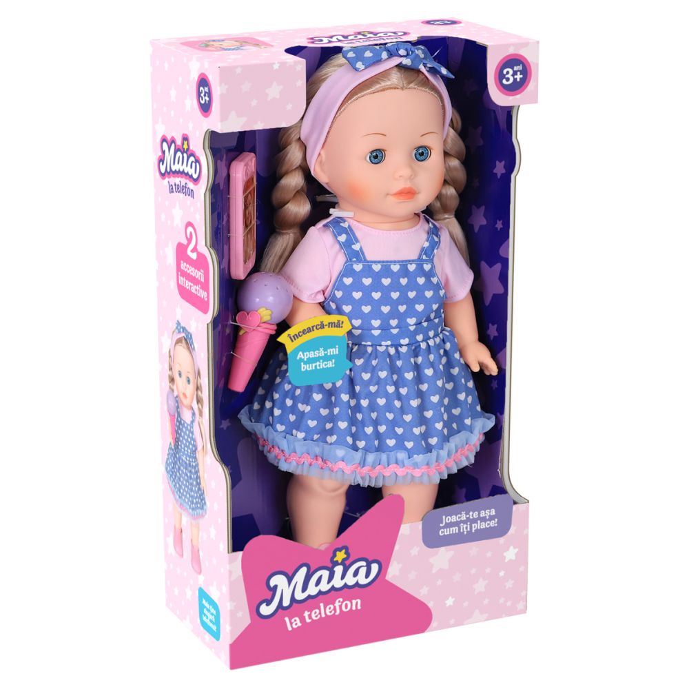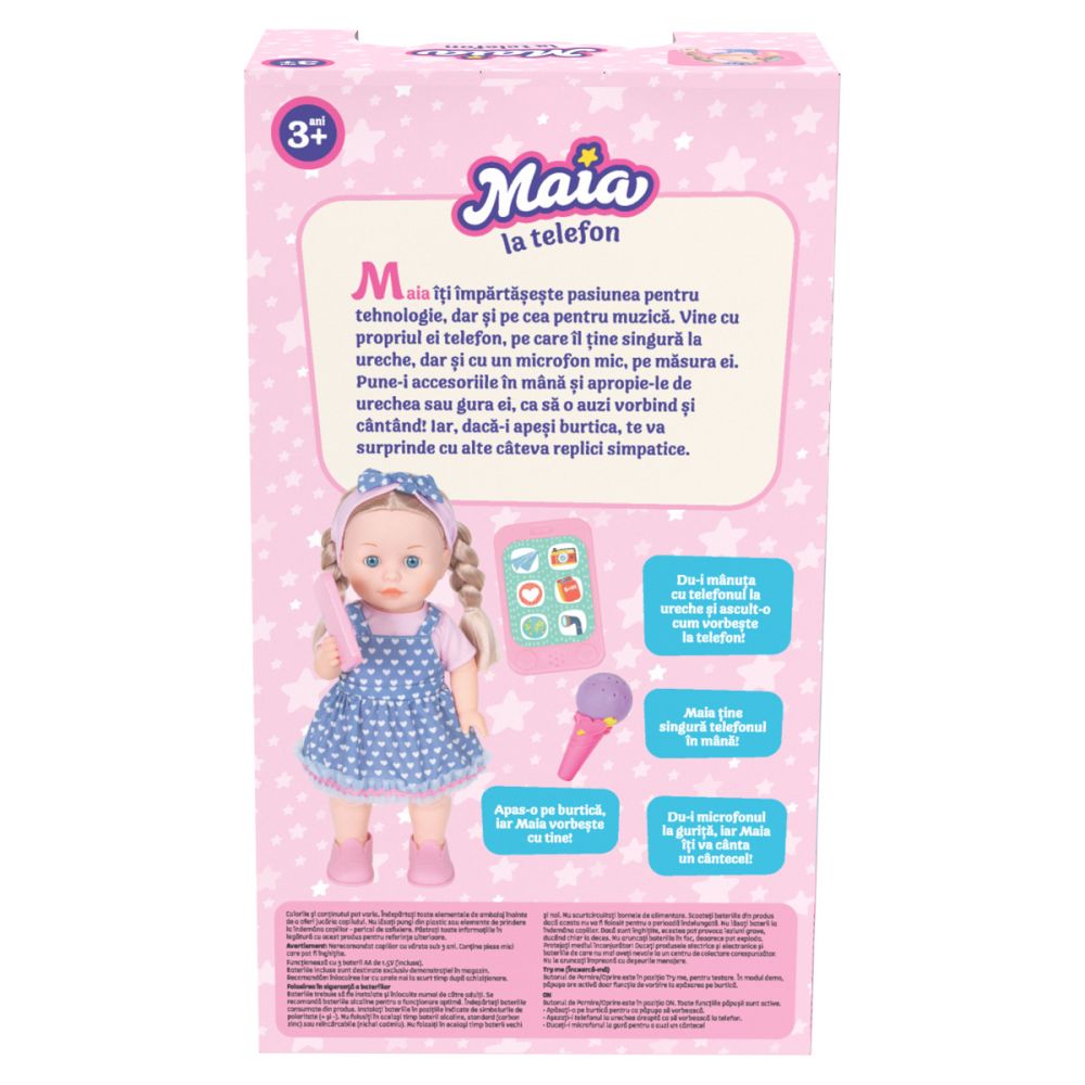 Maia a crescut si si-a descoperit pasiunea pentru cantat. Du-i telefonul la gura si canta cu ea. Ii place si sa vorbeasca la telefon si poate chiar sa tina singura telefonul la ureche. Functiile interactive se activeaza automat atunci cand apropiati microfonul de gura papusii si telefonul de urechea ei. Pachetul contine: - 1 x papusa Maia; - 1 x microfon interactiv; - 1 x telefon interactiv. Dimensiuni produs in ambalaj: 24 x 12 x 43 cm Nota! Produsul functioneaza cu 3x baterii de tip AA(incluse). Varsta recomandata: 3 ani +