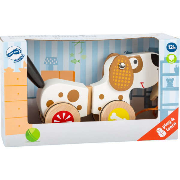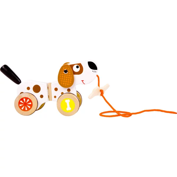 Woof woof! Cei mici pot trage acest cățel simpatic după ei. Inelele de cauciuc de pe roți îl fac foarte tăcut. El mișcă urechile și coada și arată minunat în fiecare curbă. Oasele de pe lesă sunt oferite drept recompensă.