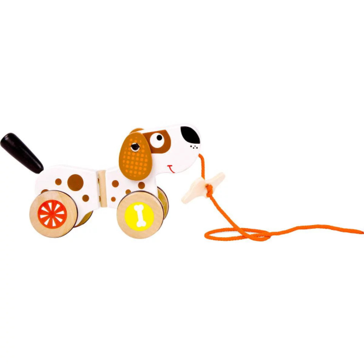 - Design atrăgător: Cățelul din lemn are un aspect colorat și vesel, captivând atenția copiilor.