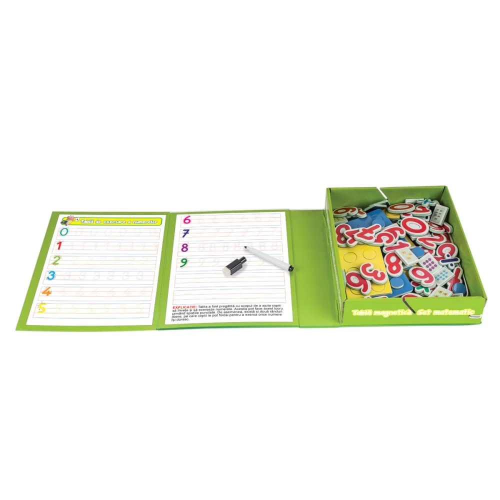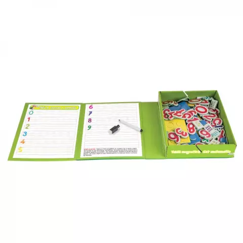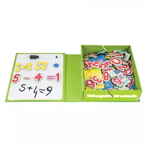 Cei mici vor invata matematica intr-un mod mult mai usor si mai amuzant, cu setul matematic cu tabla pentru scris de la Smile Games. Acest set contine diferite elemente magnetice ce ii ajuta pe cei mici sa descopere lumea fascinanta a matematicii, intr-un mod interactiv si amuzant. Pachetul contine: - 20x numere magnetice; - 60x piese de joc rotunde si magnetice; - 11x cartonase magnetice cu ilustratii; - 1x stilou pentru scris, cu burete pentru sters; - 1x ghid de activitati colorat cu jocuri educative.