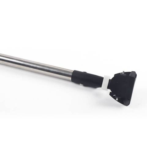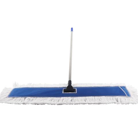 Mop profesional cu cap din bumbac alb de 90 cm și coadă metalică rezistentă de 135 cm, ideal pentru curățarea eficientă a suprafețelor mari. Capul cu inserție albastră oferă absorbție superioară, perfect pentru spații comerciale și casnice. Design ergonomic cu mâner confortabil.