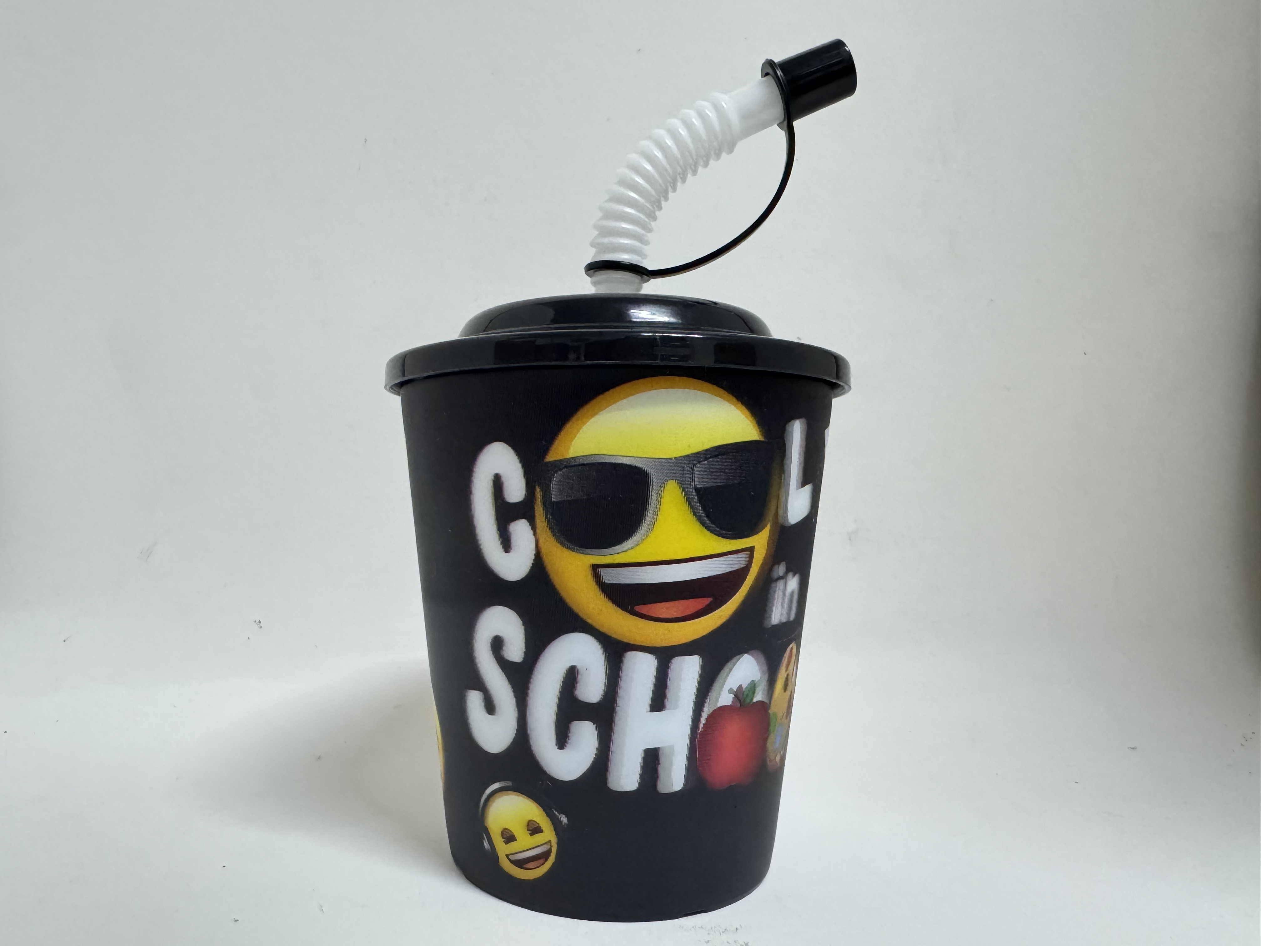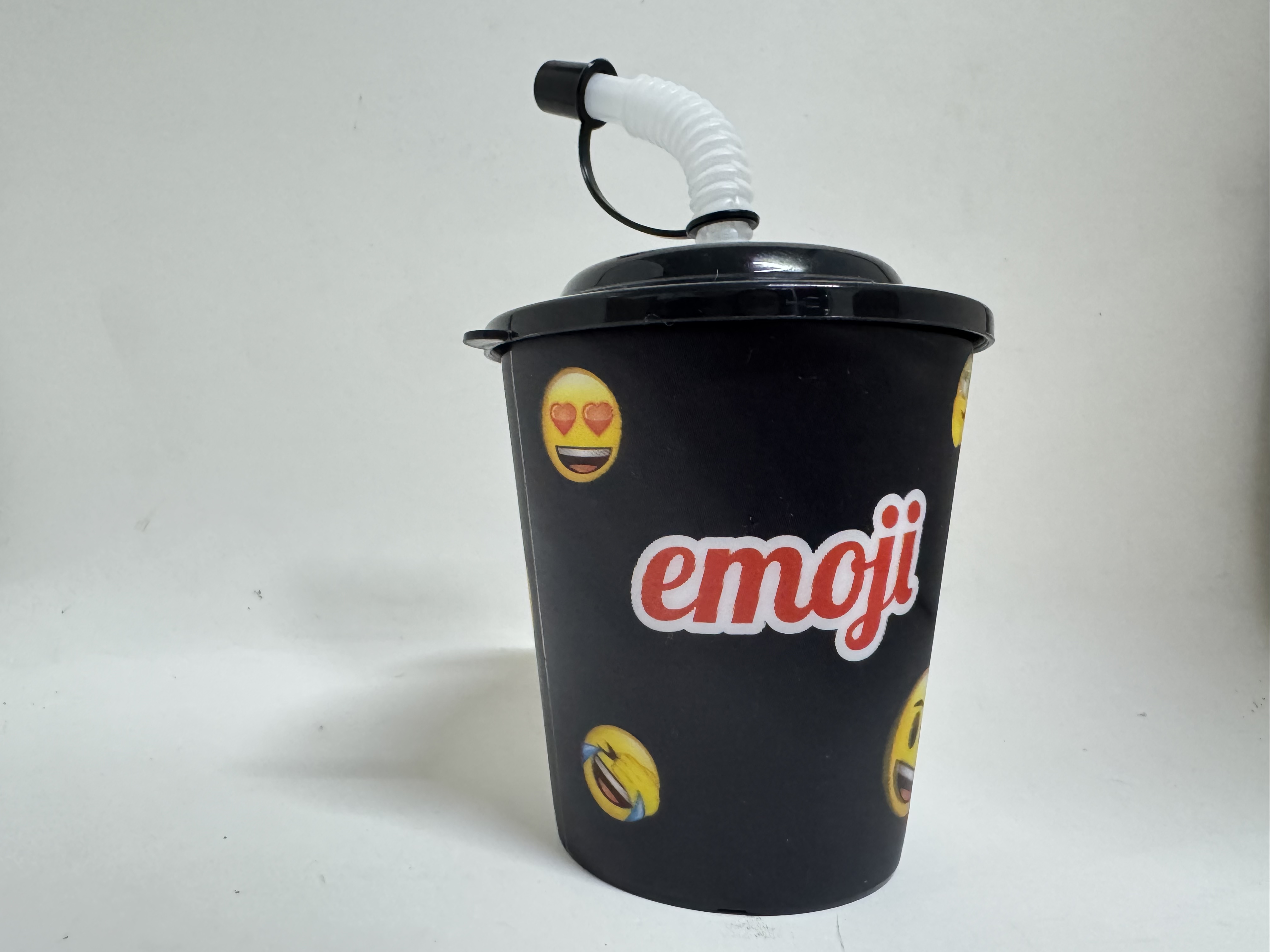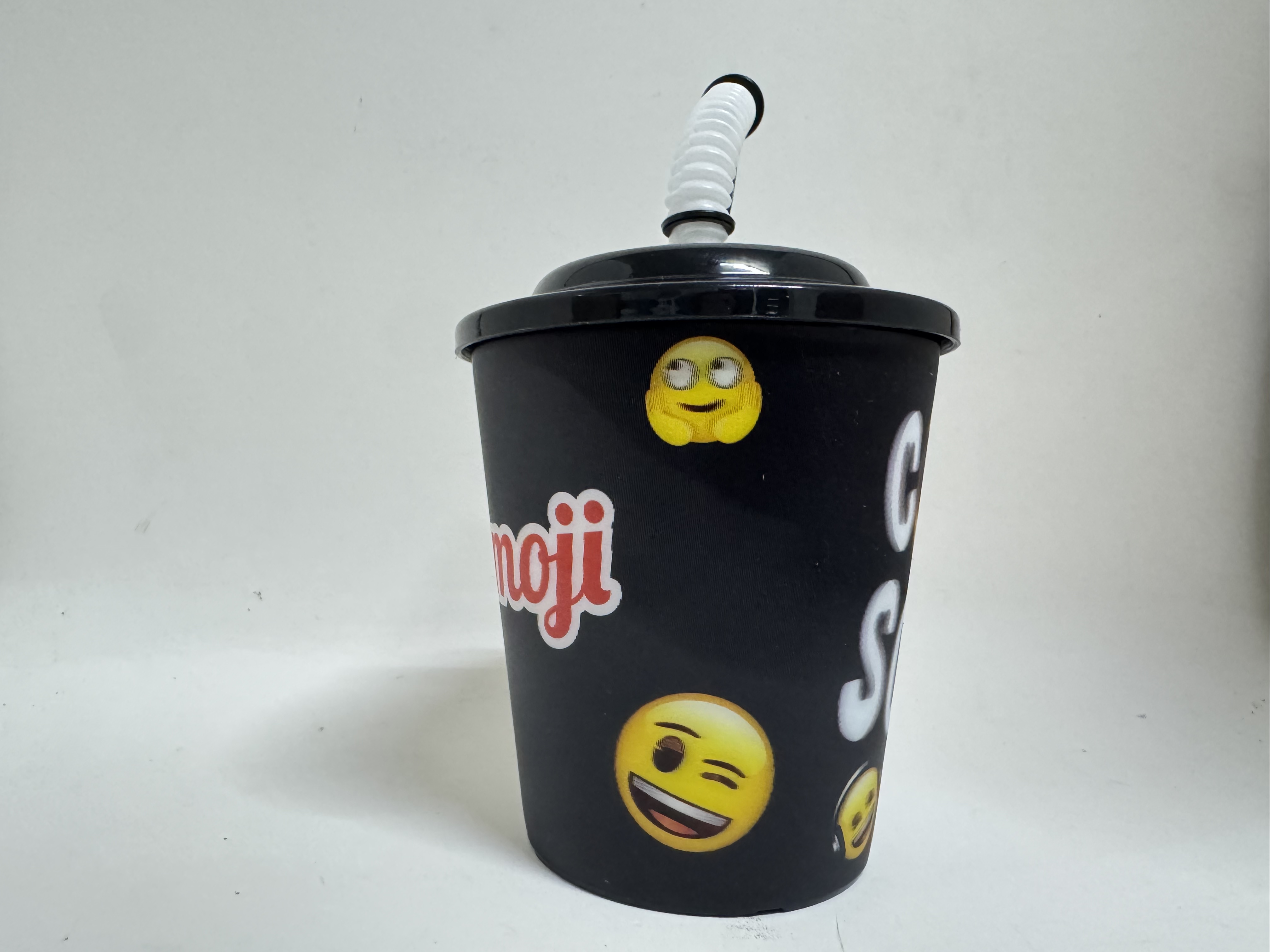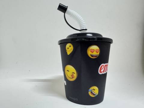 Pahar negru cu capac și pai de 260ml, decorat cu emoji-uri vesele. Ideal pentru băuturi răcoritoare, cu design practic și modern. Capacul previne scurgerile, iar paiul inclus oferă confort maxim pentru copii și adulți. Perfect pentru acasă, birou sau călătorii.