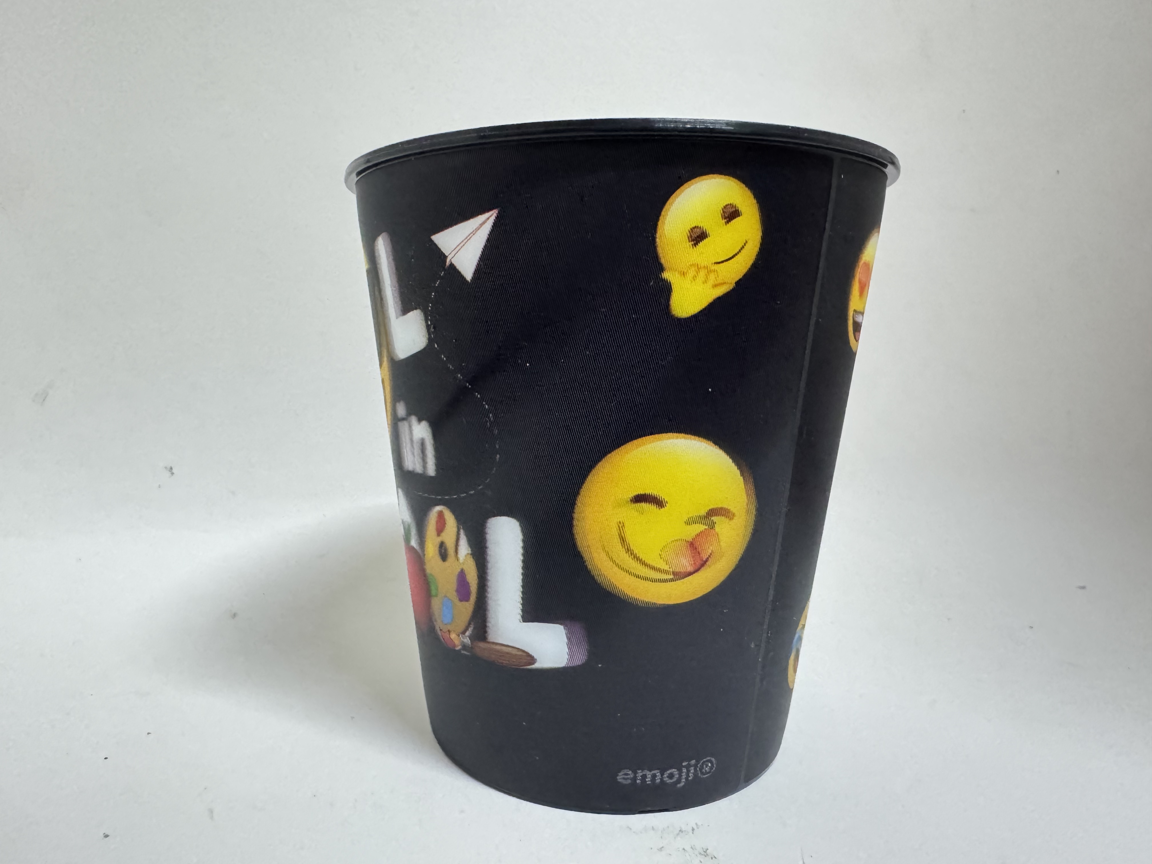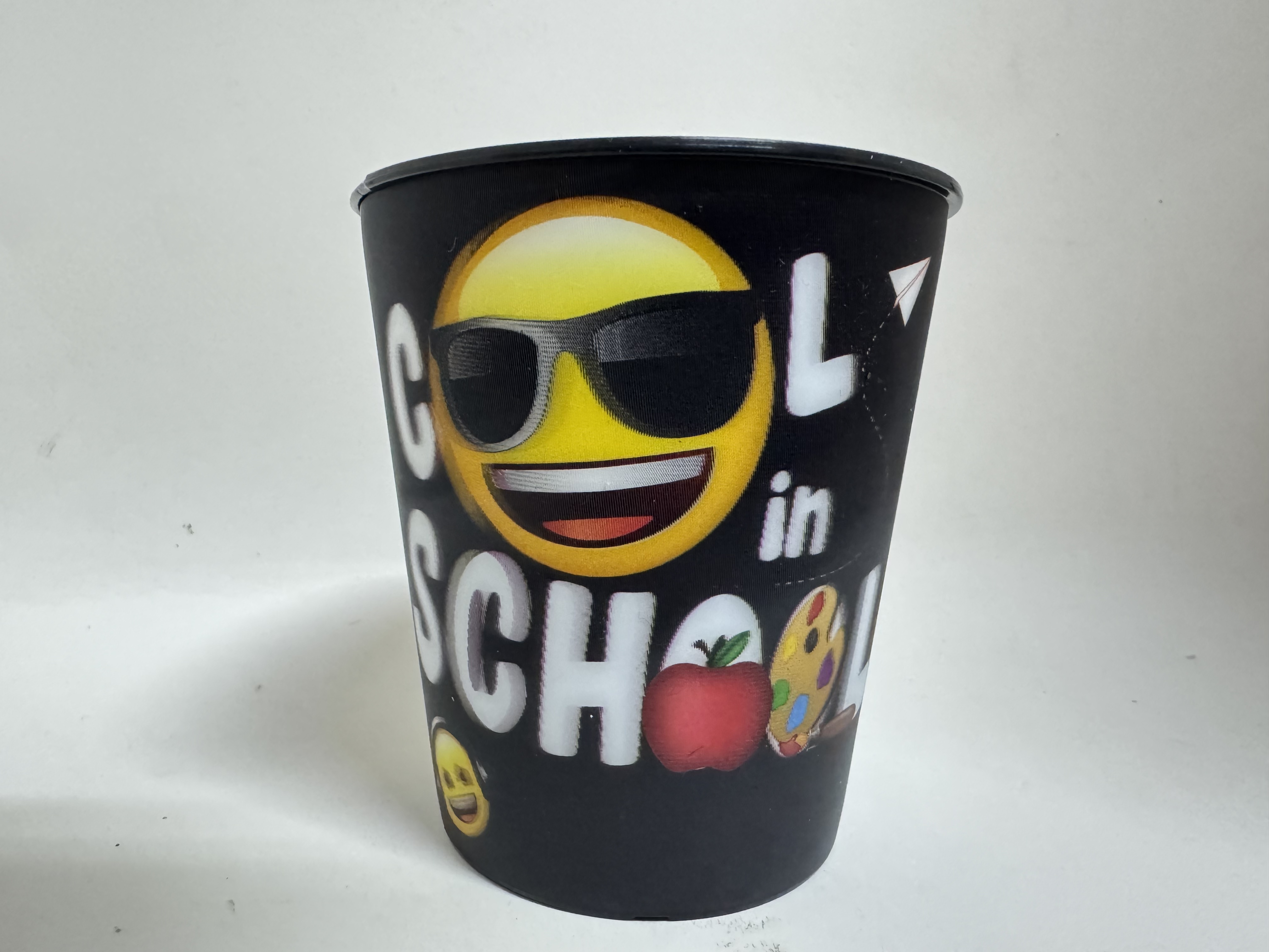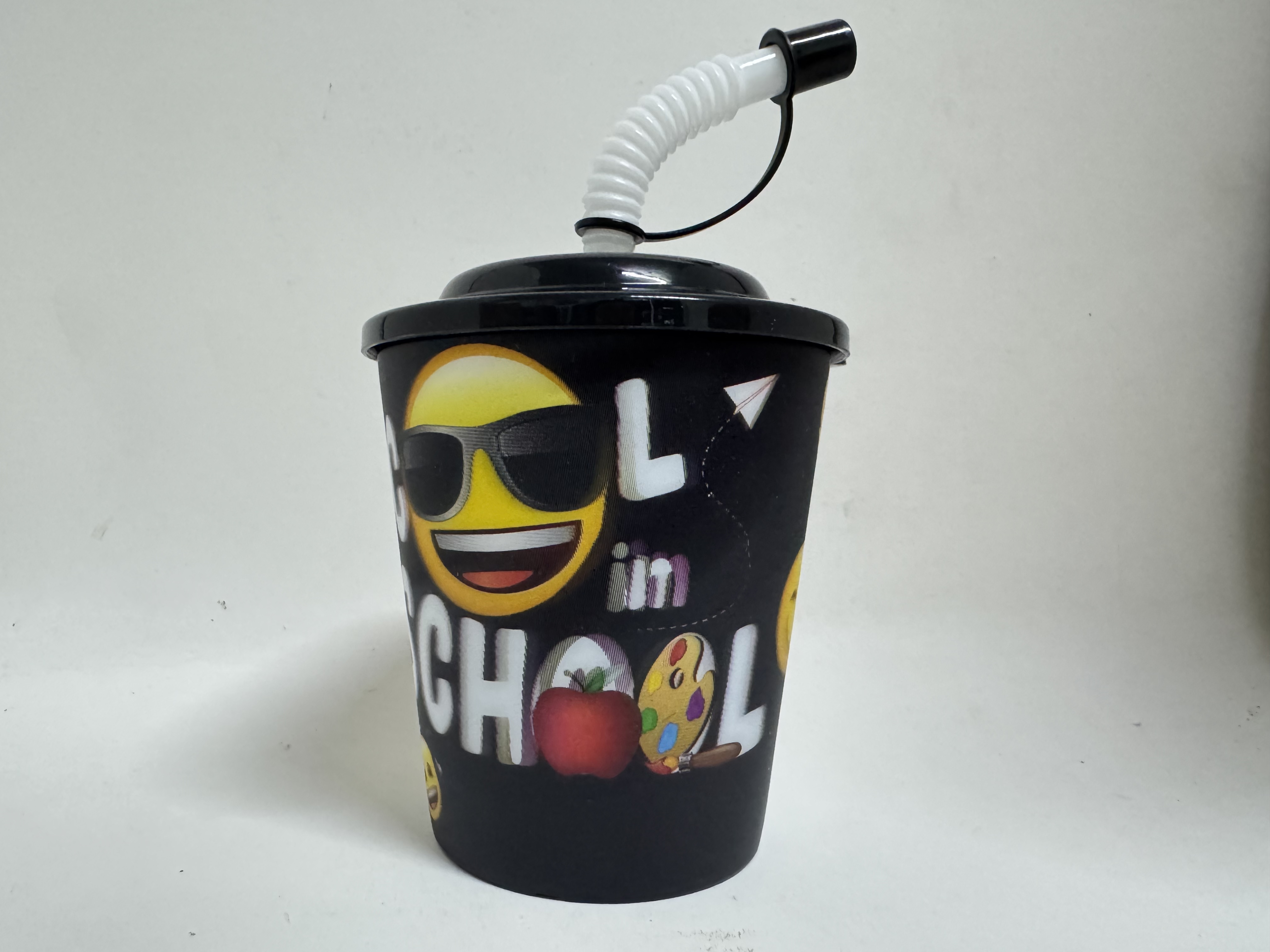 Pahar negru cu capac și pai de 260ml, decorat cu emoji-uri vesele. Ideal pentru băuturi răcoritoare, cu design practic și modern. Capacul previne scurgerile, iar paiul inclus oferă confort maxim pentru copii și adulți. Perfect pentru acasă, birou sau călătorii.