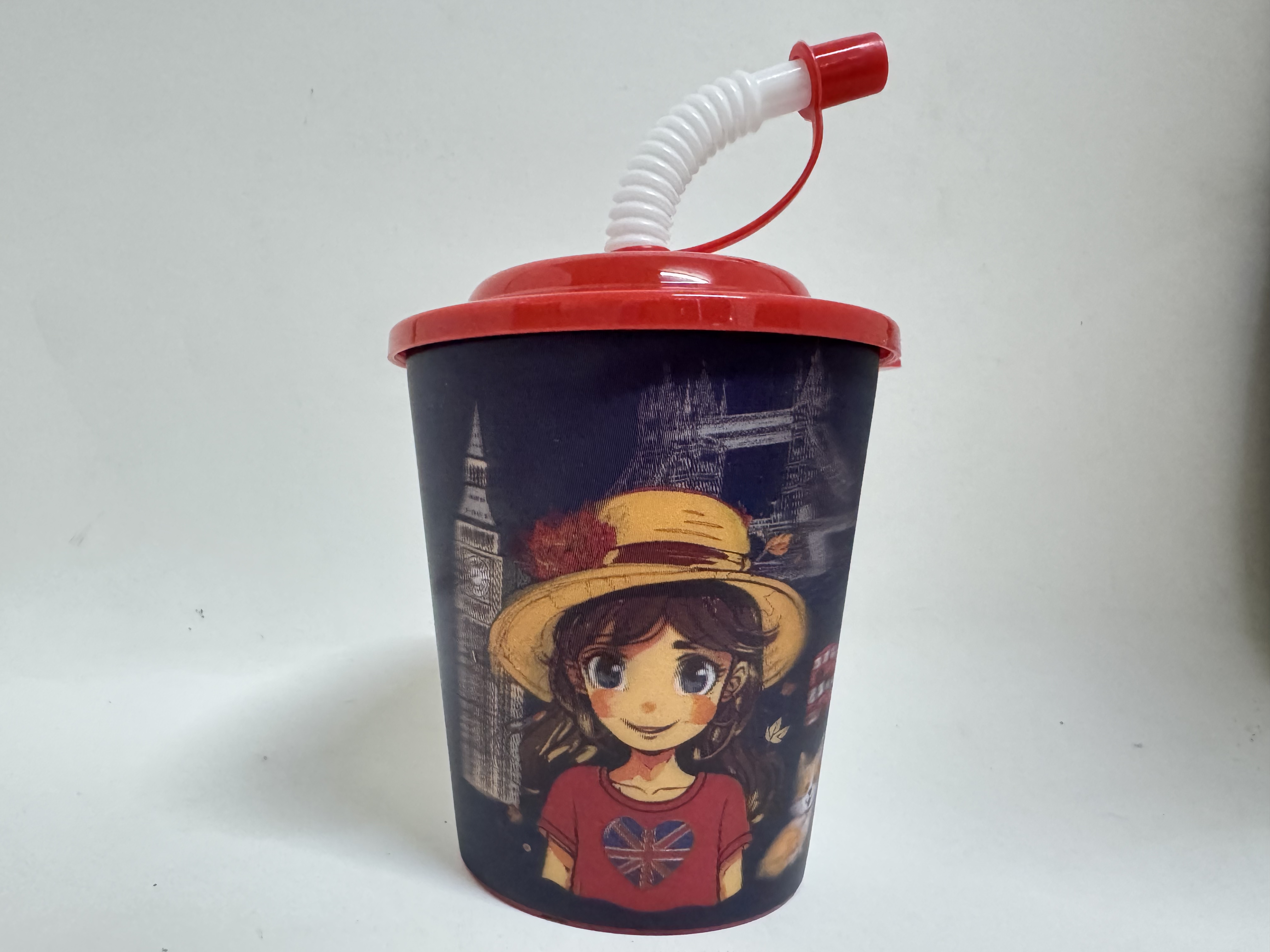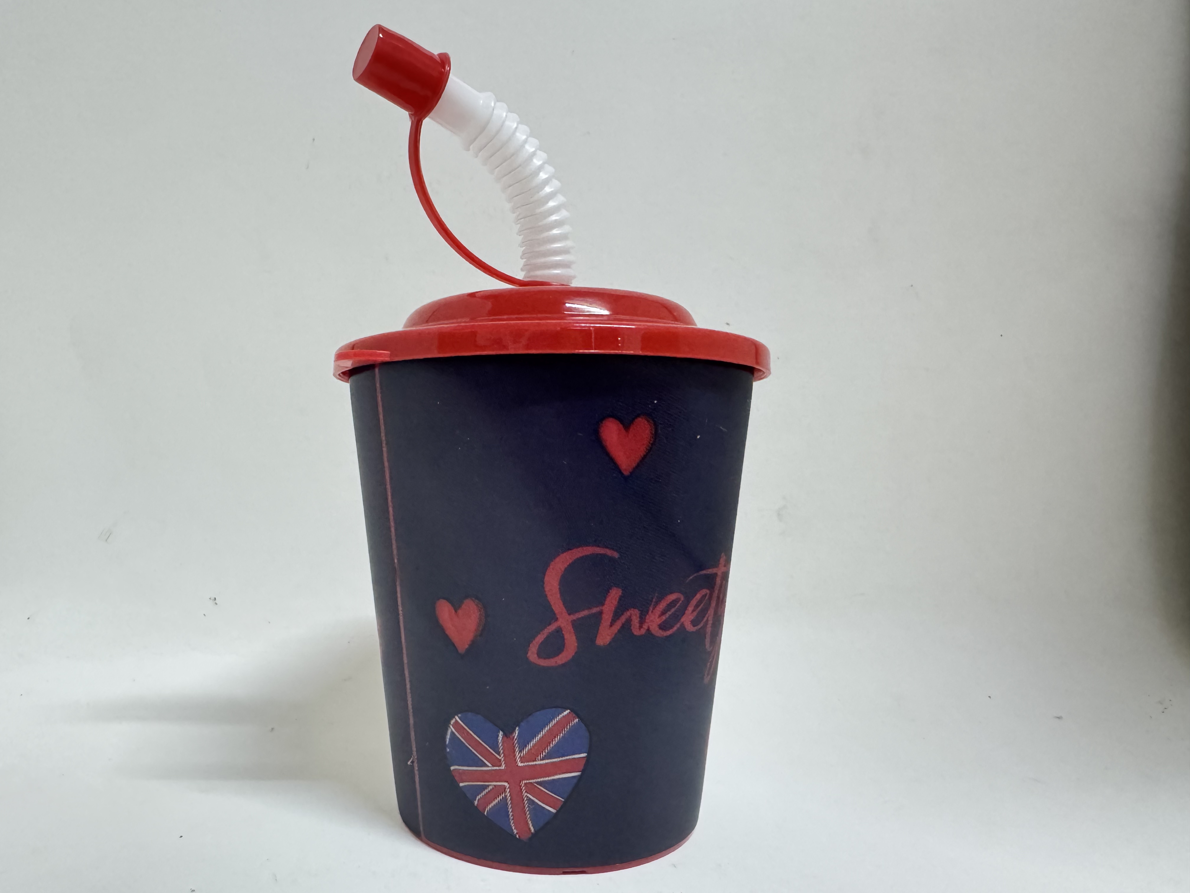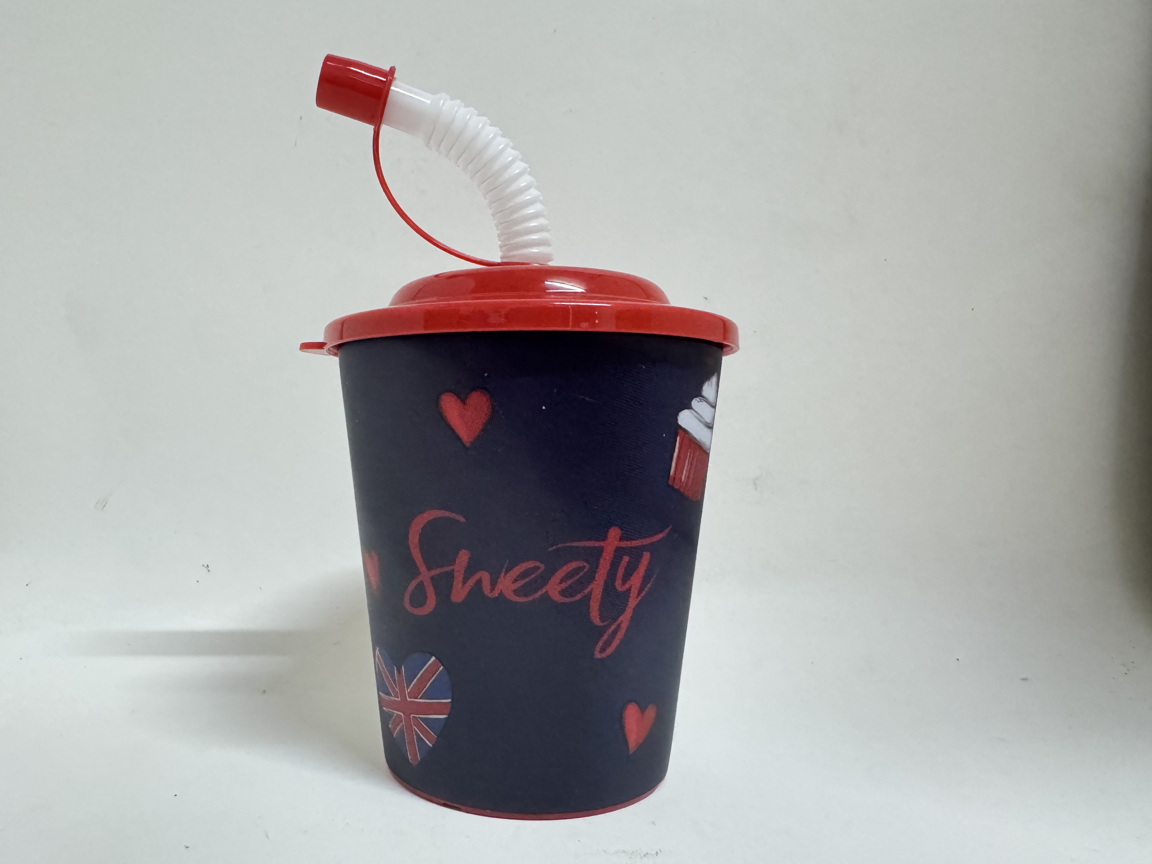 Pahar din plastic cu pai și capac 260ml Sweety EN în albastru, perfect pentru copii. Design colorat cu ilustrații vesele, capac etanș și pai reutilizabil inclus. Ideal pentru băuturi reci la școală, în parc sau acasă, ușor de transportat și sigur pentru cei mici.