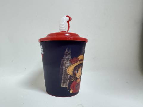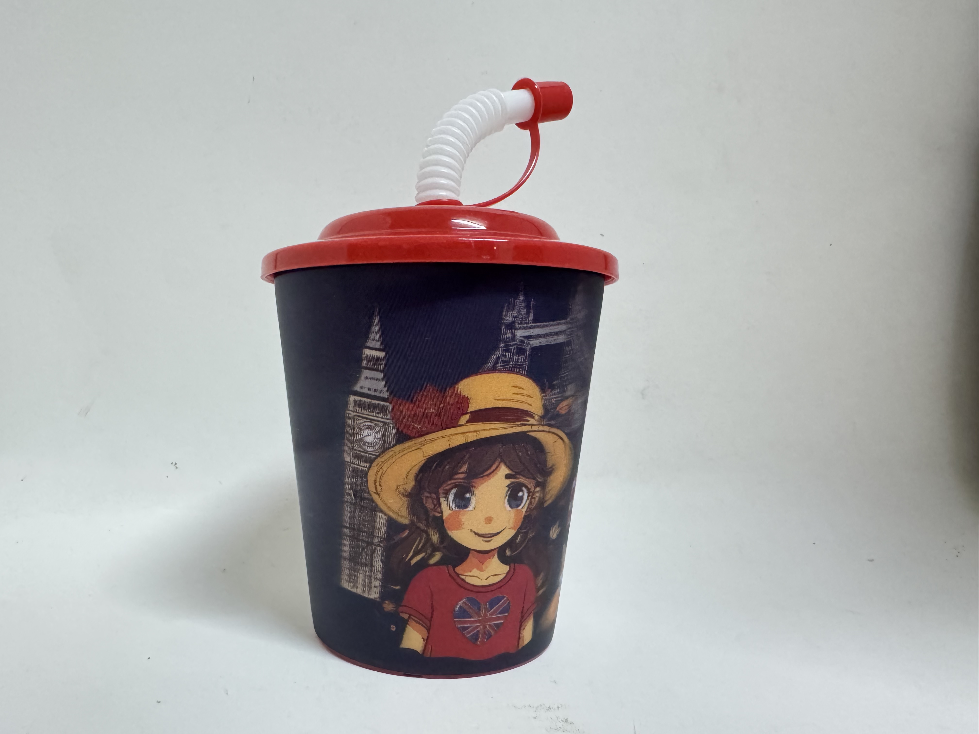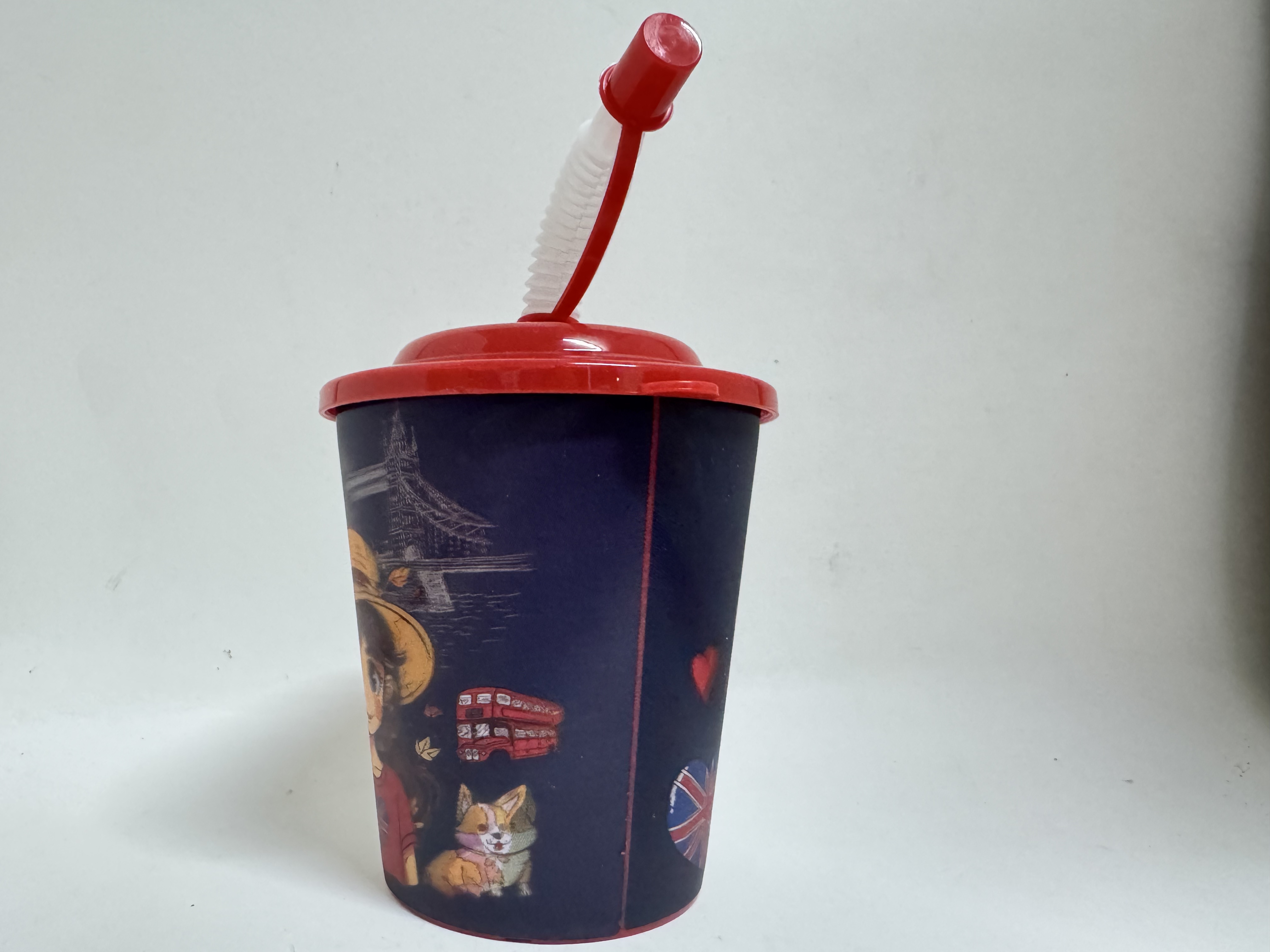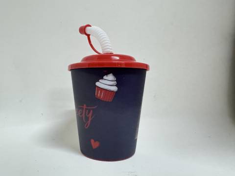 Pahar din plastic cu pai și capac 260ml Sweety EN în albastru, perfect pentru copii. Design colorat cu ilustrații vesele, capac etanș și pai reutilizabil inclus. Ideal pentru băuturi reci la școală, în parc sau acasă, ușor de transportat și sigur pentru cei mici.