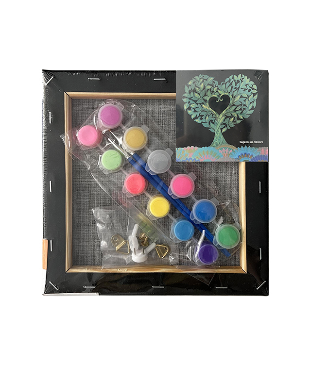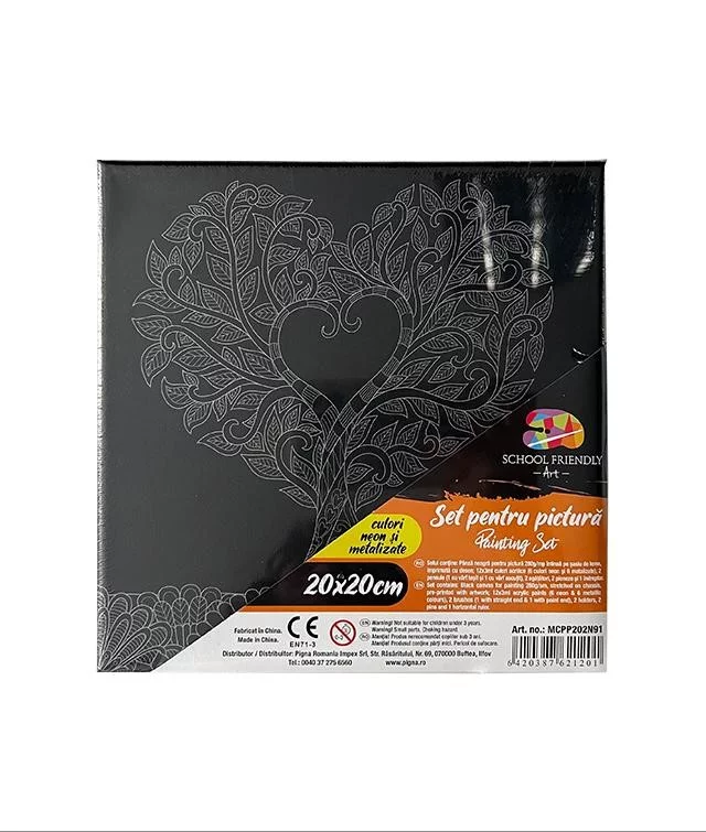 Setul contine: Panza neagra pentru pictura 280g/mp intinsa pe sasiu de lemn, imprimata cu desen; 12x3ml culori acrilice (6 culori neon si 6 metalizate), 2 pensule ( 1 cu varf tesit si 1 cu varf ascutit), 2 agatatori, 2 pioneze si 1 indreptar.