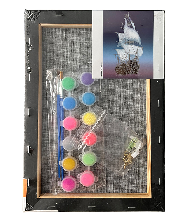 Setul contine: Panza neagra pentru pictura 280g/mp intinsa pe sasiu de lemn, imprimata cu desen; 12x3ml culori acrilice (6 culori neon si 6 metalizate), 2 pensule ( 1 cu varf tesit si 1 cu varf ascutit), 2 agatatori, 2 pioneze si 1 indreptar.