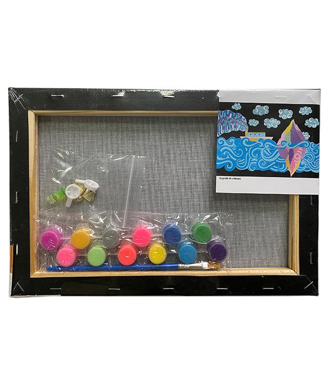 Setul contine: Panza neagra pentru pictura 280g/mp intinsa pe sasiu de lemn, imprimata cu desen; 12x3ml culori acrilice (6 culori neon si 6 metalizate), 2 pensule ( 1 cu varf tesit si 1 cu varf ascutit), 2 agatatori, 2 pioneze si 1 indreptar.