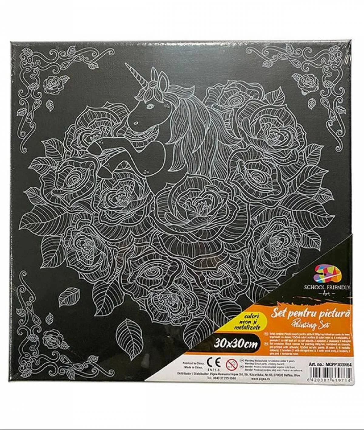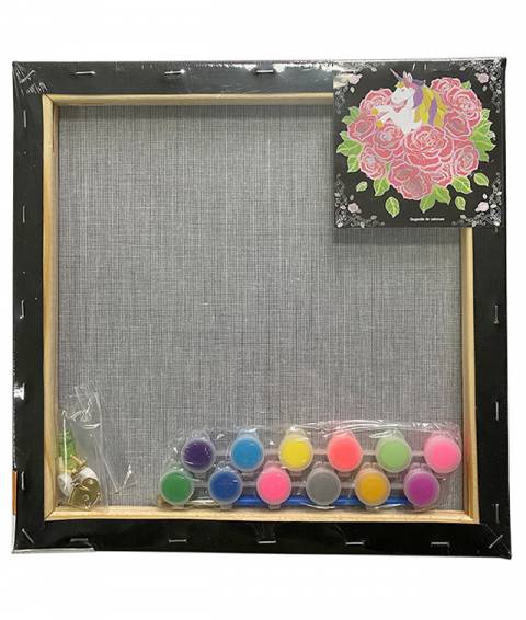 Setul contine: Panza neagra pentru pictura 280g/mp intinsa pe sasiu de lemn, imprimata cu desen; 12x3ml culori acrilice (6 culori neon si 6 metalizate), 2 pensule ( 1 cu varf tesit si 1 cu varf ascutit), 2 agatatori, 2 pioneze si 1 indreptar.