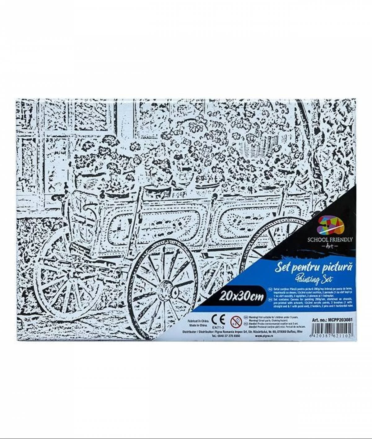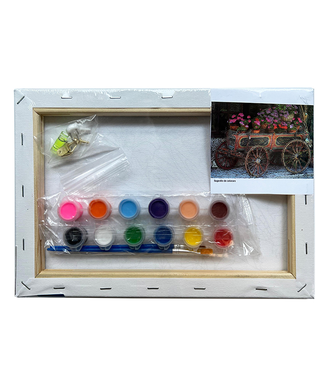 Setul contine: Panza pentru pictura 280g/mp intinsa pe sasiu de lemn, imprimata cu desen; 12x3ml culori acrilice (6 culori neon si 6 metalizate), 2 pensule ( 1 cu varf tesit si 1 cu varf ascutit), 2 agatatori, 2 pioneze si 1 indreptar.