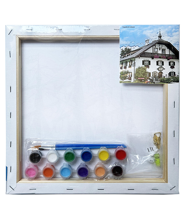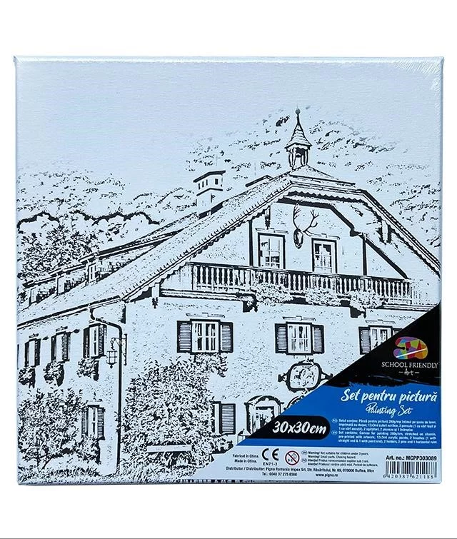 Setul contine: Panza pentru pictura 280g/mp intinsa pe sasiu de lemn, imprimata cu desen; 12x3ml culori acrilice (6 culori neon si 6 metalizate), 2 pensule ( 1 cu varf tesit si 1 cu varf ascutit), 2 agatatori, 2 pioneze si 1 indreptar.