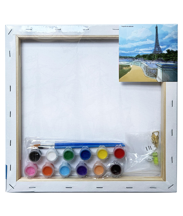 Setul contine: Panza pentru pictura 280g/mp intinsa pe sasiu de lemn, imprimata cu desen; 12x3ml culori acrilice (6 culori neon si 6 metalizate), 2 pensule ( 1 cu varf tesit si 1 cu varf ascutit), 2 agatatori, 2 pioneze si 1 indreptar.