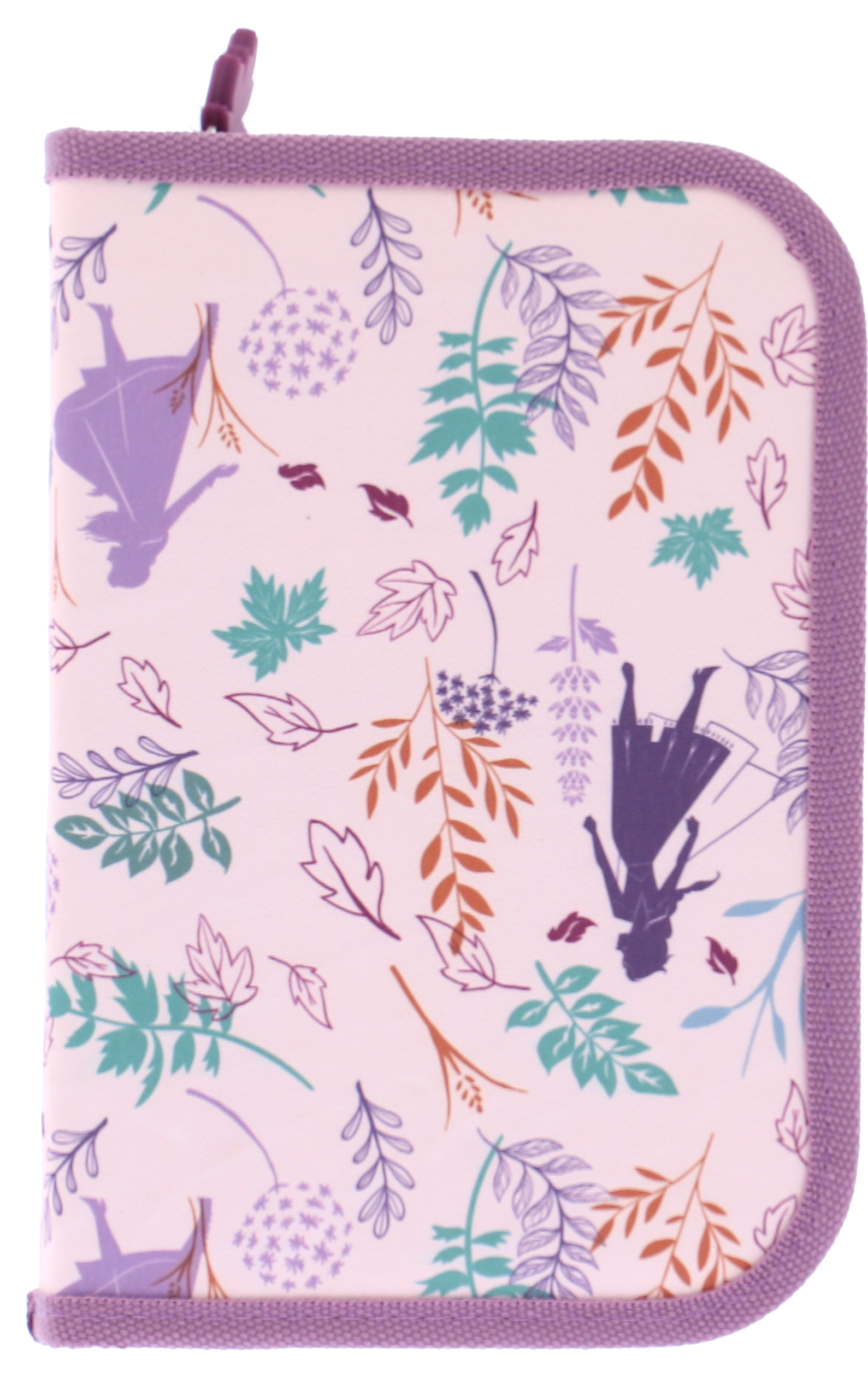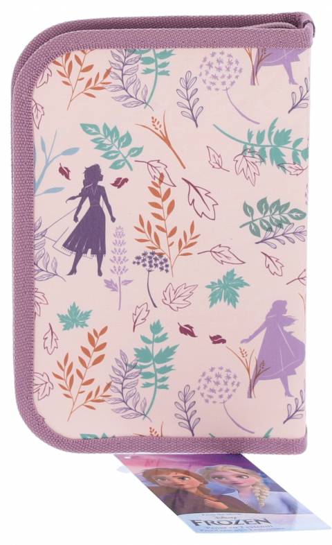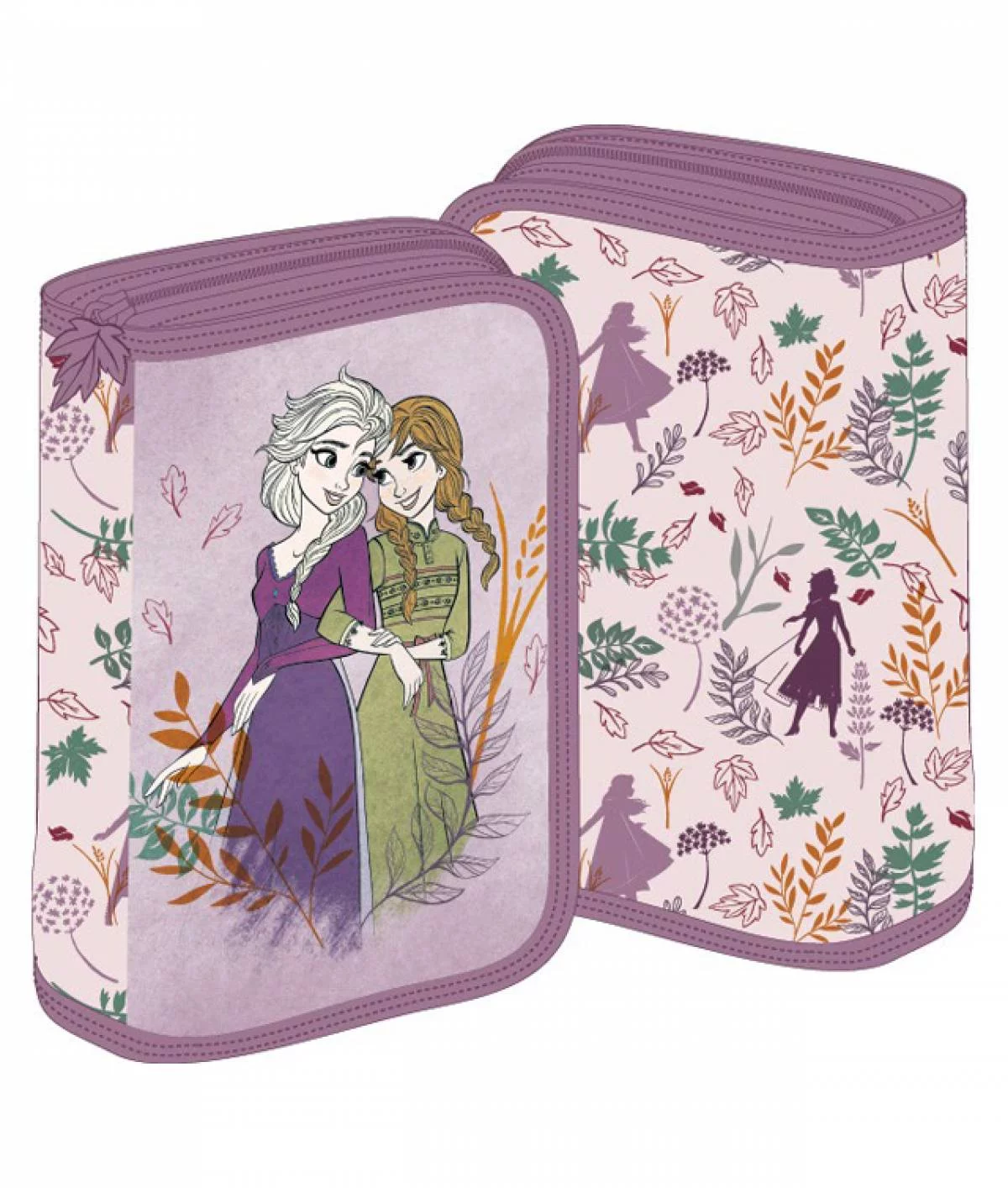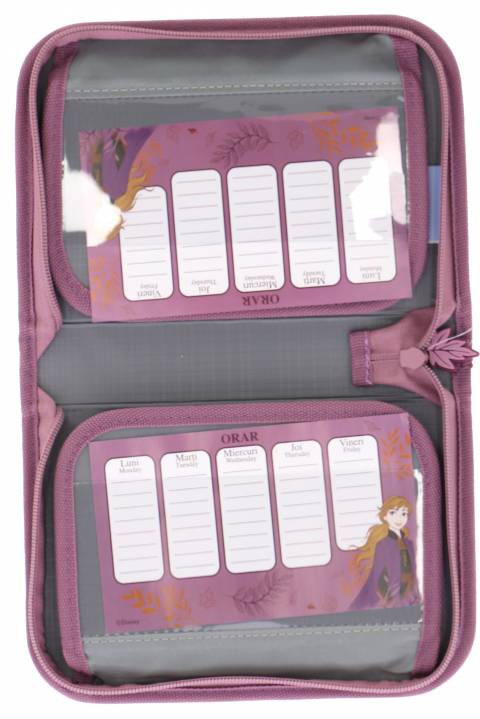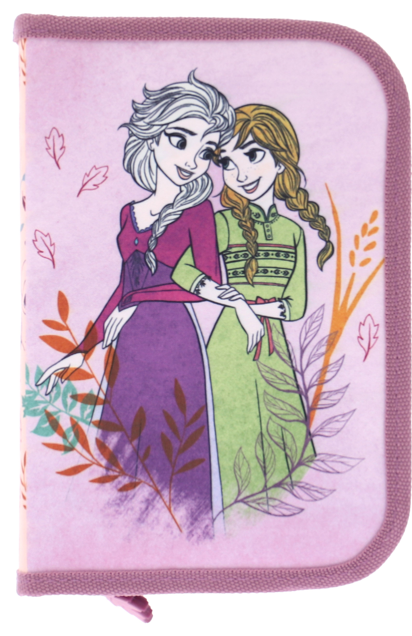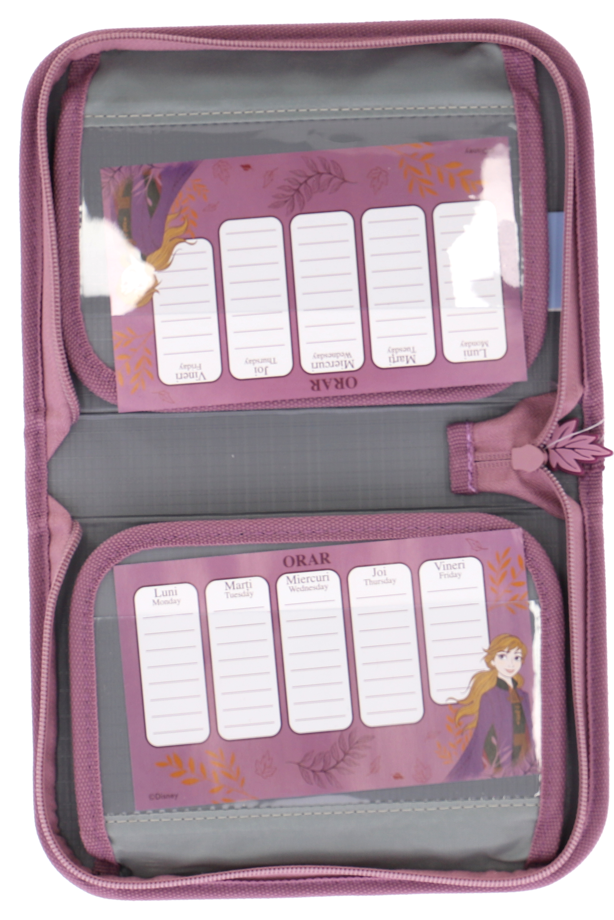 Penar Frozen roz cu un compartiment principal și două extensii laterale, ideal pentru organizarea rechizitelor școlare. Design captivant cu personajele Elsa și Anna pe fundal mov-liliachiu, înconjurate de motive florale delicate. Fermoar rezistent și material durabil pentru utilizare zilnică.