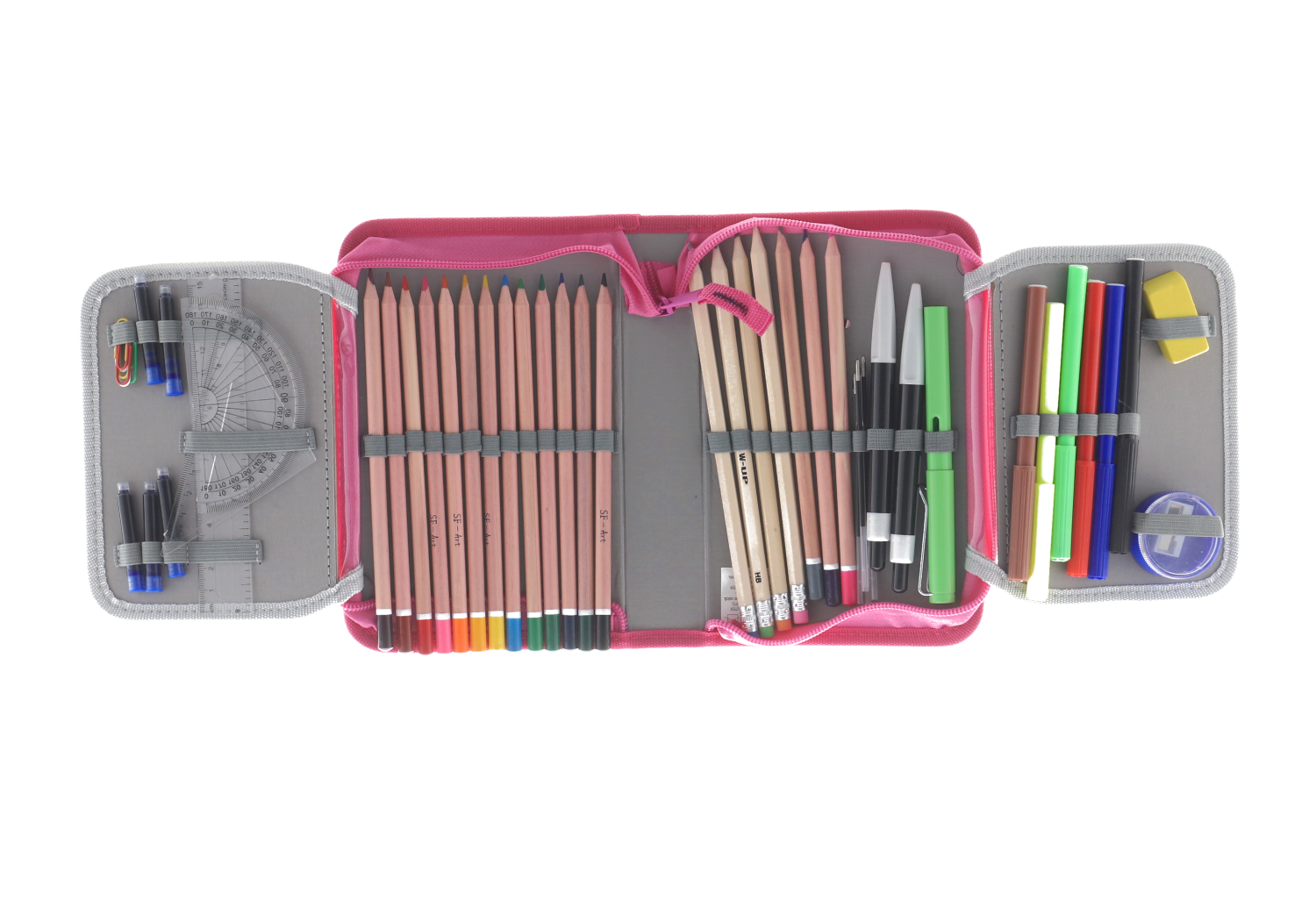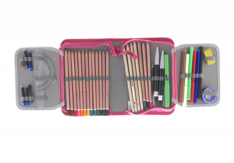 Penar cu 2 extensii, echipat cu 50 piese: 16 creioane colorate, 1 radieră, 1 ascuțitoare cu container, 4 creioane HB cu radieră la capăt, 1 riglă de 15 cm, 1 echer, 1 raportor, 1 stilou, 5 rezerve cerneală, 6 carioci, 2 orare, 2 pixuri, 5 rezerve pix și 4 agrafe.