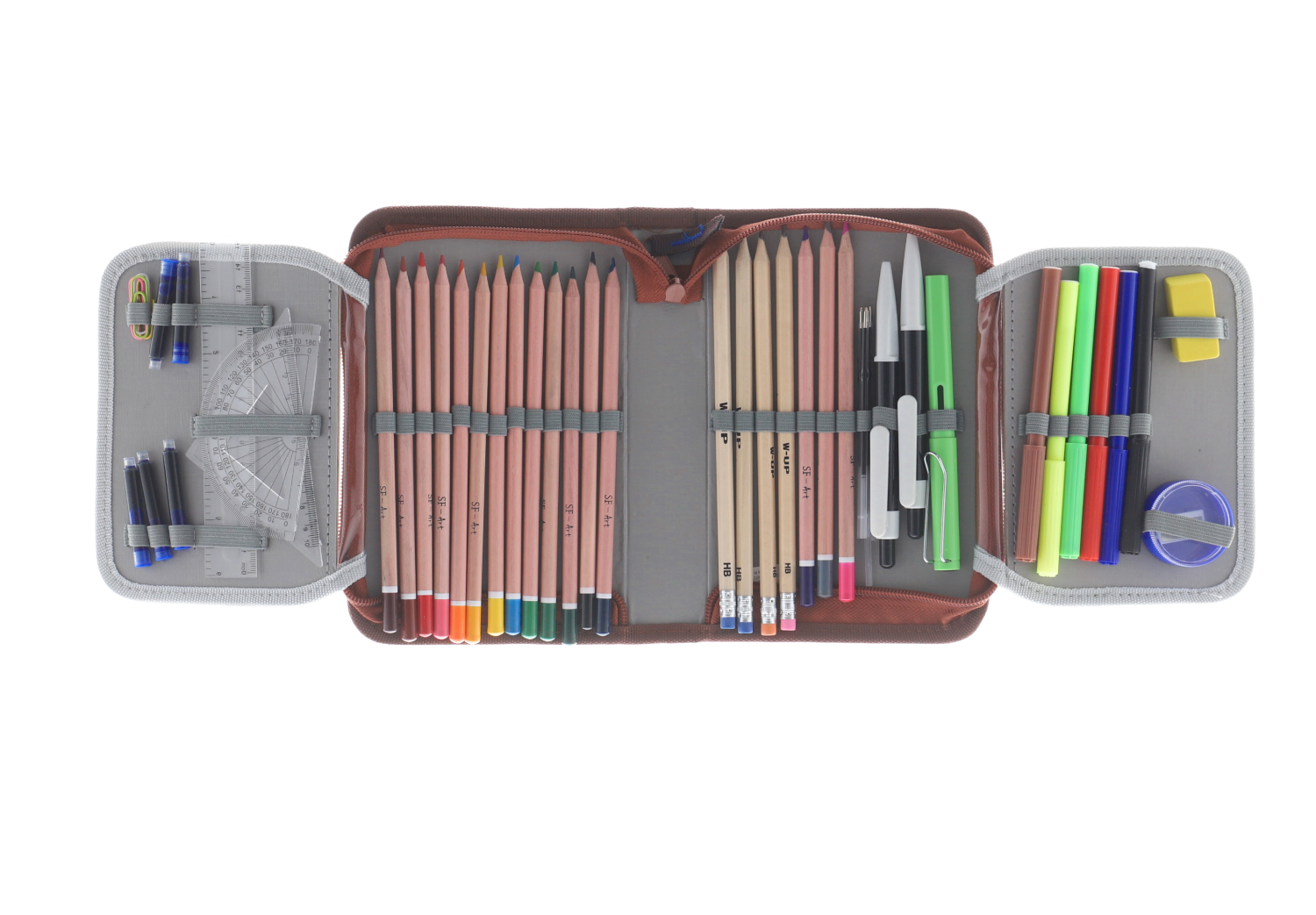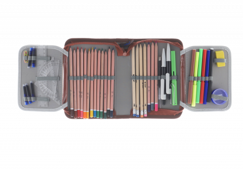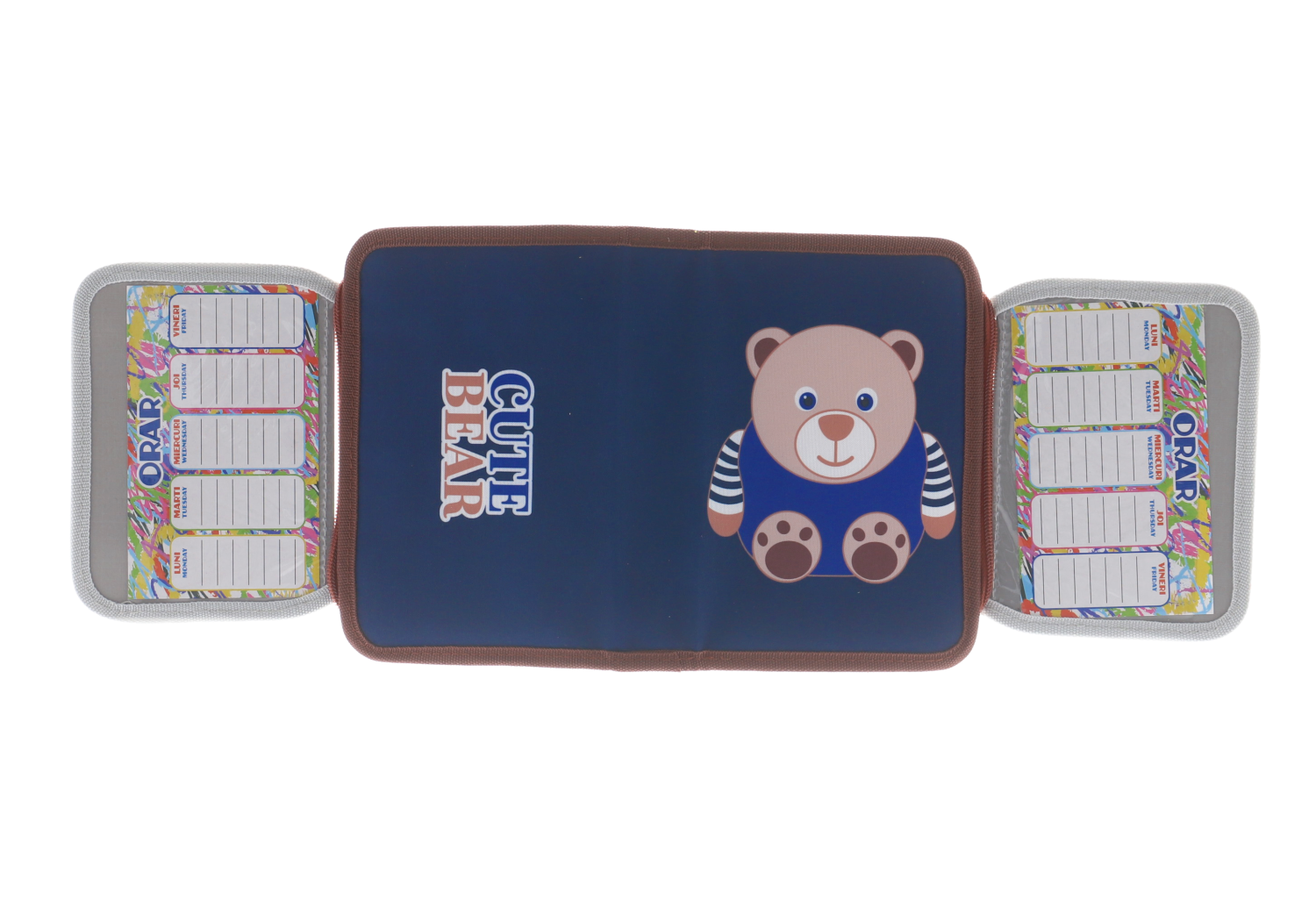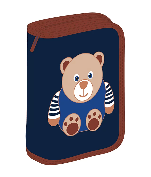 Penar echipat Schoolfriendly cu design prietenos cu ursuleț pe fond albastru închis și margini maro, ideal pentru școală. Dispune de un compartiment spațios cu fermoar rezistent și două extensii practice pentru organizarea eficientă a rechizitelor. Perfect pentru copii, combină funcționalitatea cu un aspect vesel și atractiv.