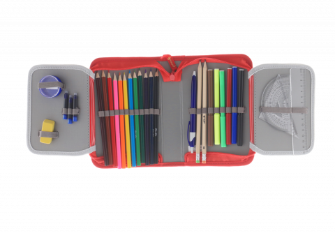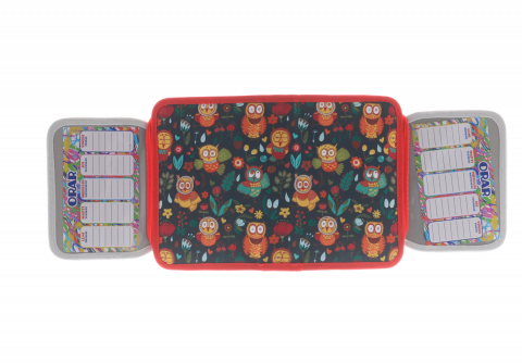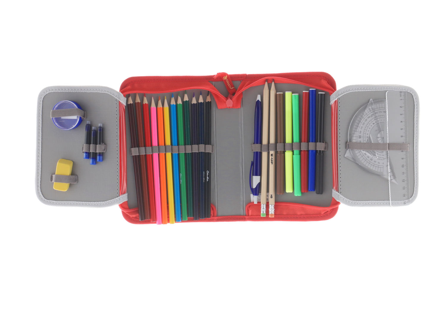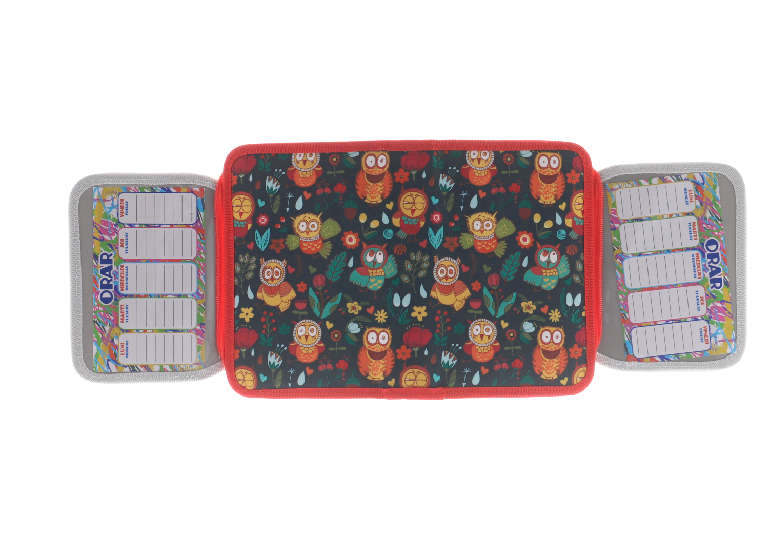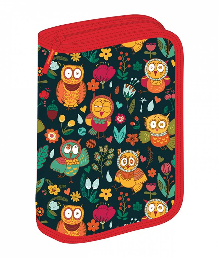 Penarul echipat Schoolfriendly Skate cu design multicolor cu bufnițe vesele și flori pe fond întunecat, cu bordură roșie, include 31 de piese esențiale pentru școală. Cu un compartiment principal și două extensii cu fermoar, acest penar practic oferă spațiu optim pentru organizarea rechizitelor, fiind ideal pentru elevi.