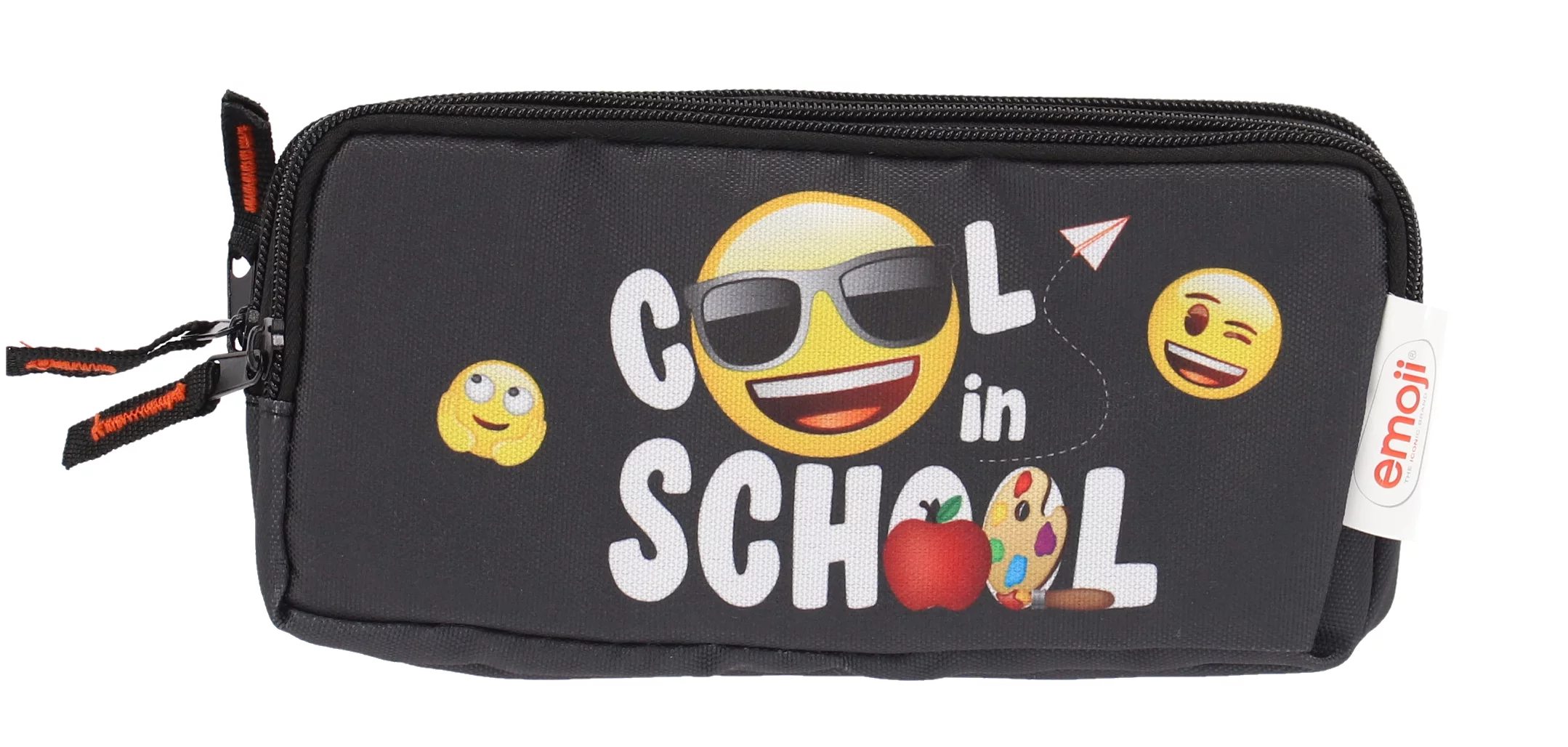 Penar dreptunghiular negru EMOJI CLASIC School cu 3 fermoare și design vesel cu emoticoane colorate. Etui spațios pentru organizarea eficientă a rechizitelor școlare, ideal pentru elevi și studenți, confecționat din materiale rezistente pentru utilizare zilnică îndelungată.