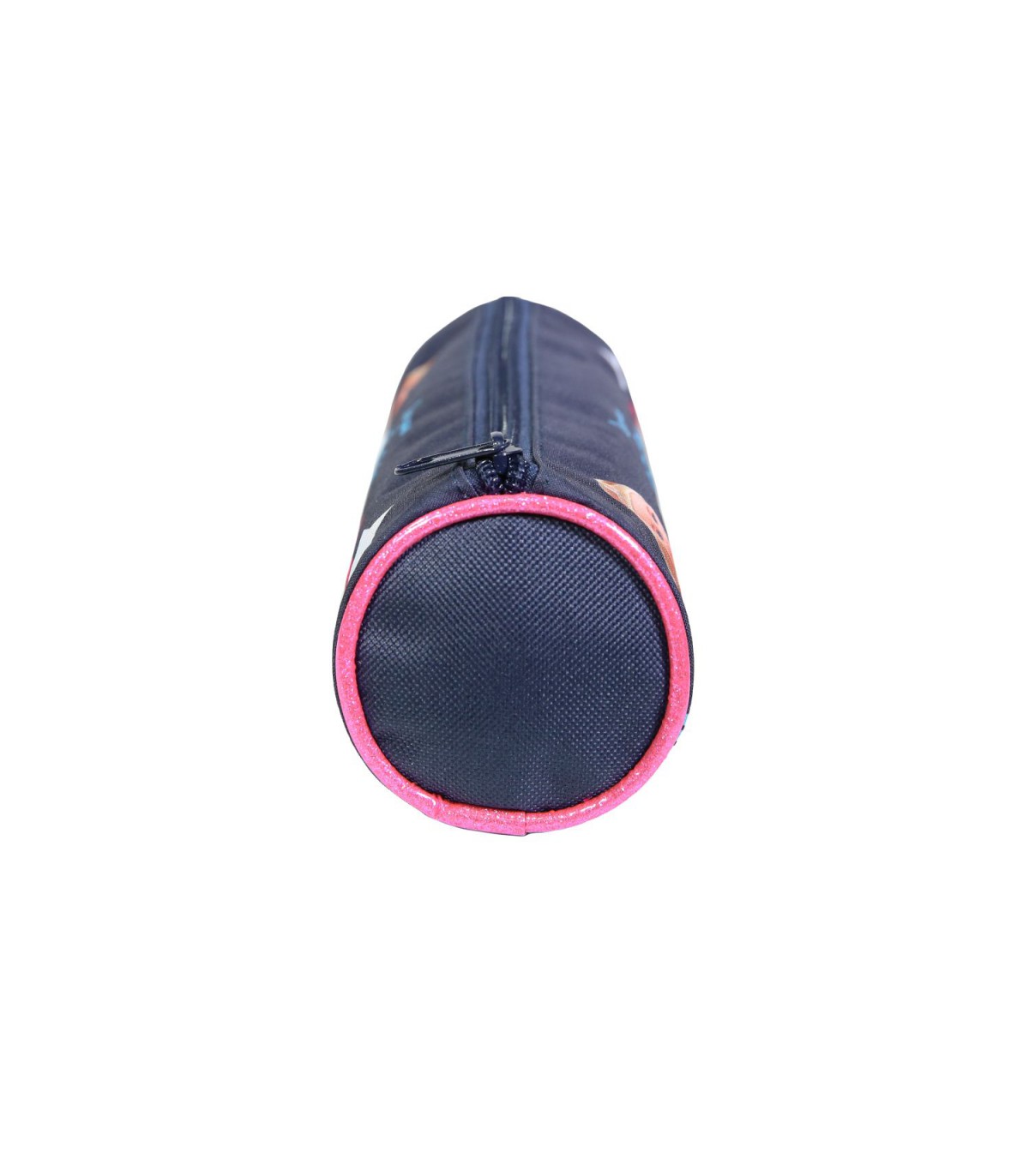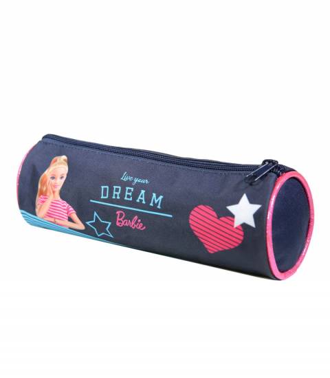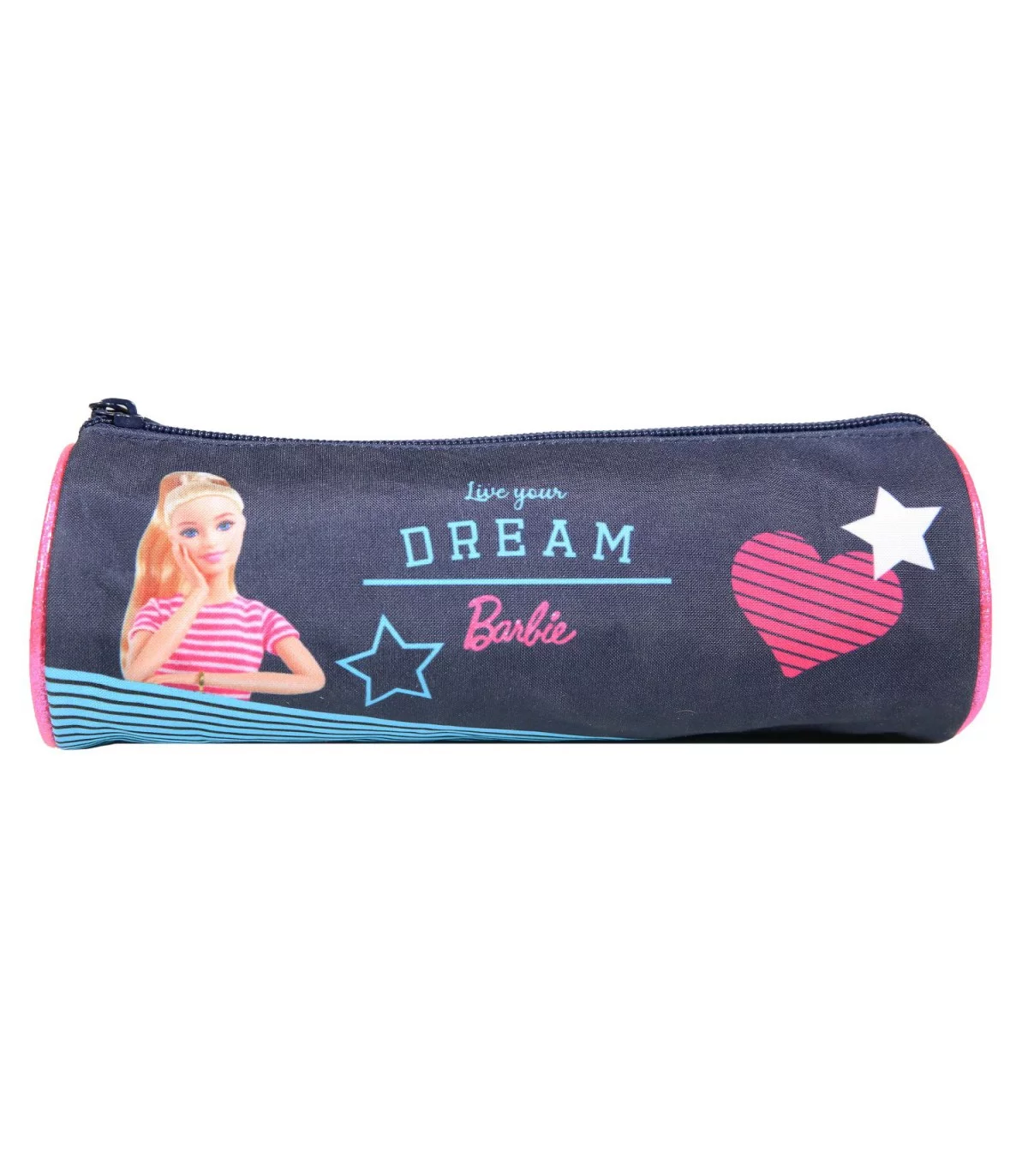 Penar tip etui Barbie în culoare albastru închis, cu fermoar rezistent și design atractiv cu mesajul "Live your Dream". Decorat cu imagini colorate, inimă roz și stele albe, acest penar cilindric compact este ideal pentru organizarea rechizitelor școlare și accesoriilor copiilor.