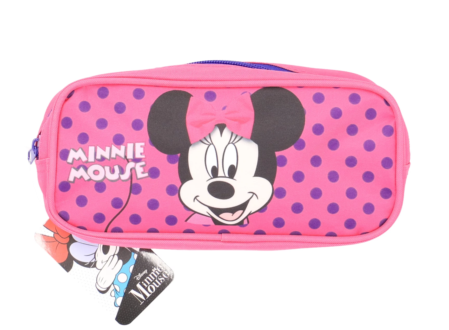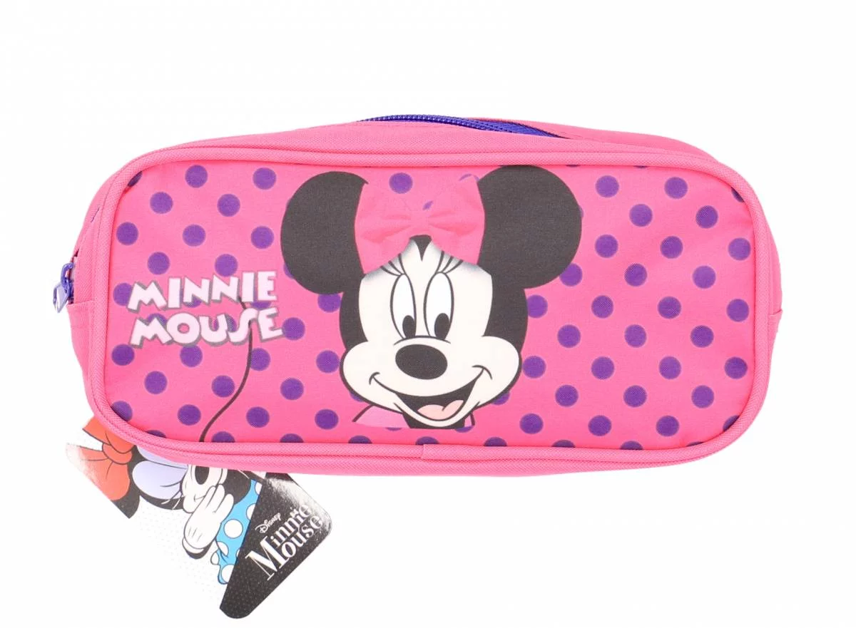 Penar tip etui Minnie Mouse în culoare roz vibrant cu buline mov, perfect pentru școală și activități creative. Design Disney oficial cu personajul iconic Minnie Mouse, fermoar violet rezistent și compartiment spațios pentru rechizite. Material textil durabil, compact și ușor de transportat în ghiozdan.