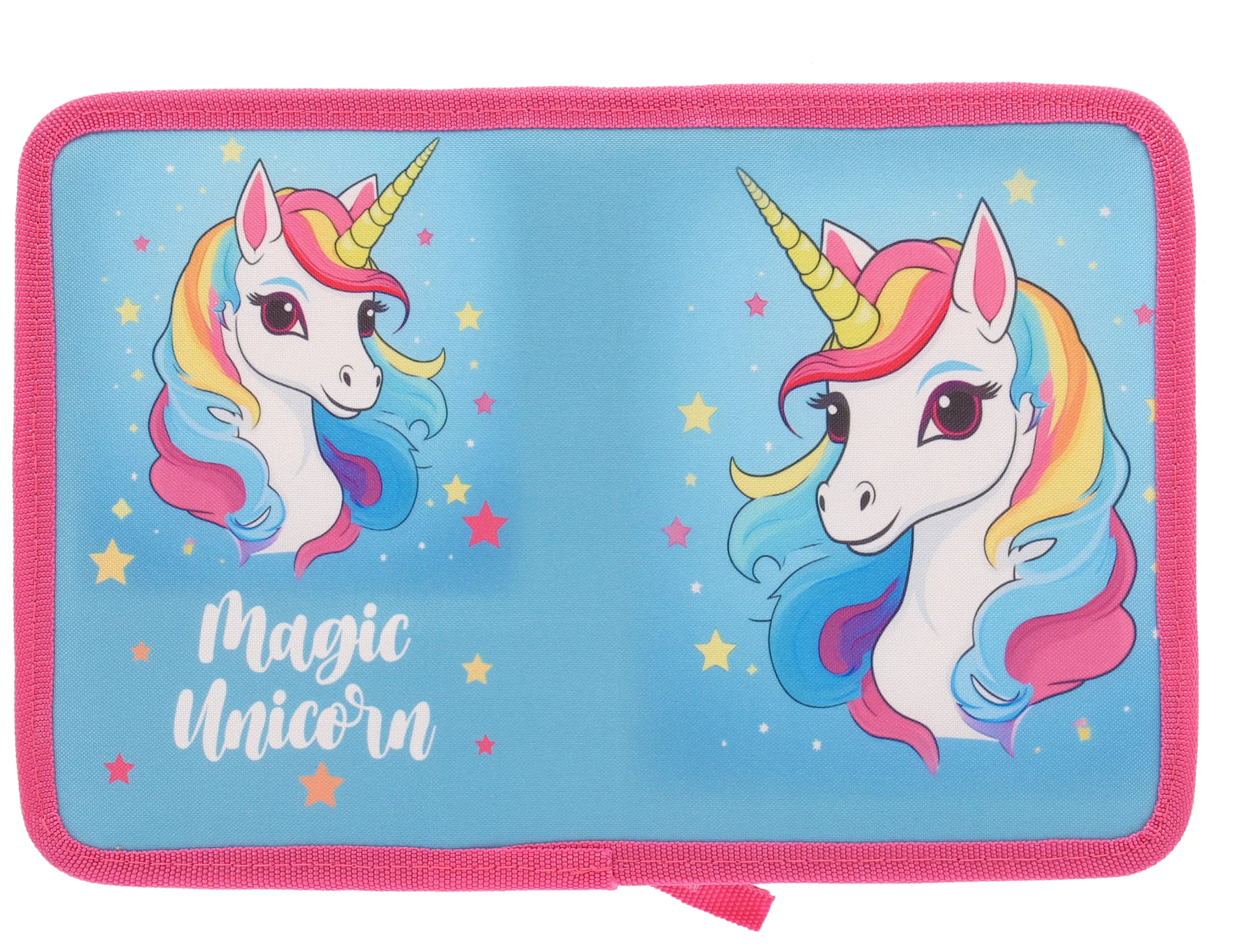 Penar școlar cu unicorn albastru, echipat complet cu 31 de piese și 2 extensii pentru organizare optimă. Design colorat cu imprimeu unicorn pe fond albastru, ideal pentru școală, compartimente multiple pentru rechizite, creioane, pixuri și accesorii. Penar copii rezistent, practic și încăpător.