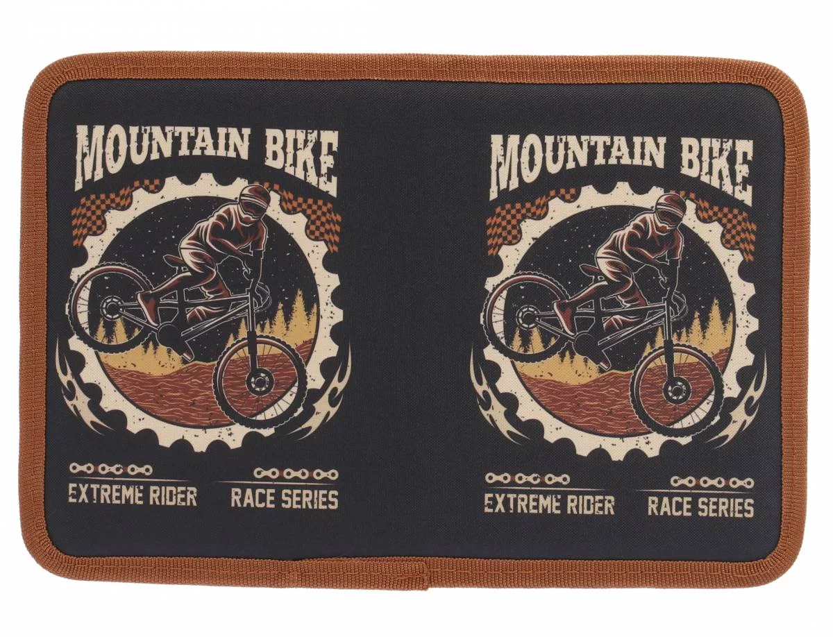 Penar școlar SF negru pentru băieți cu design MTB Adventure Ride, echipat complet cu 31 de piese incluse și 2 extensii pentru organizare optimă. Compartimentare inteligentă pentru rechizite, ideal pentru școală și activități creative, cu ilustrație dinamică pe tema ciclismului montan.