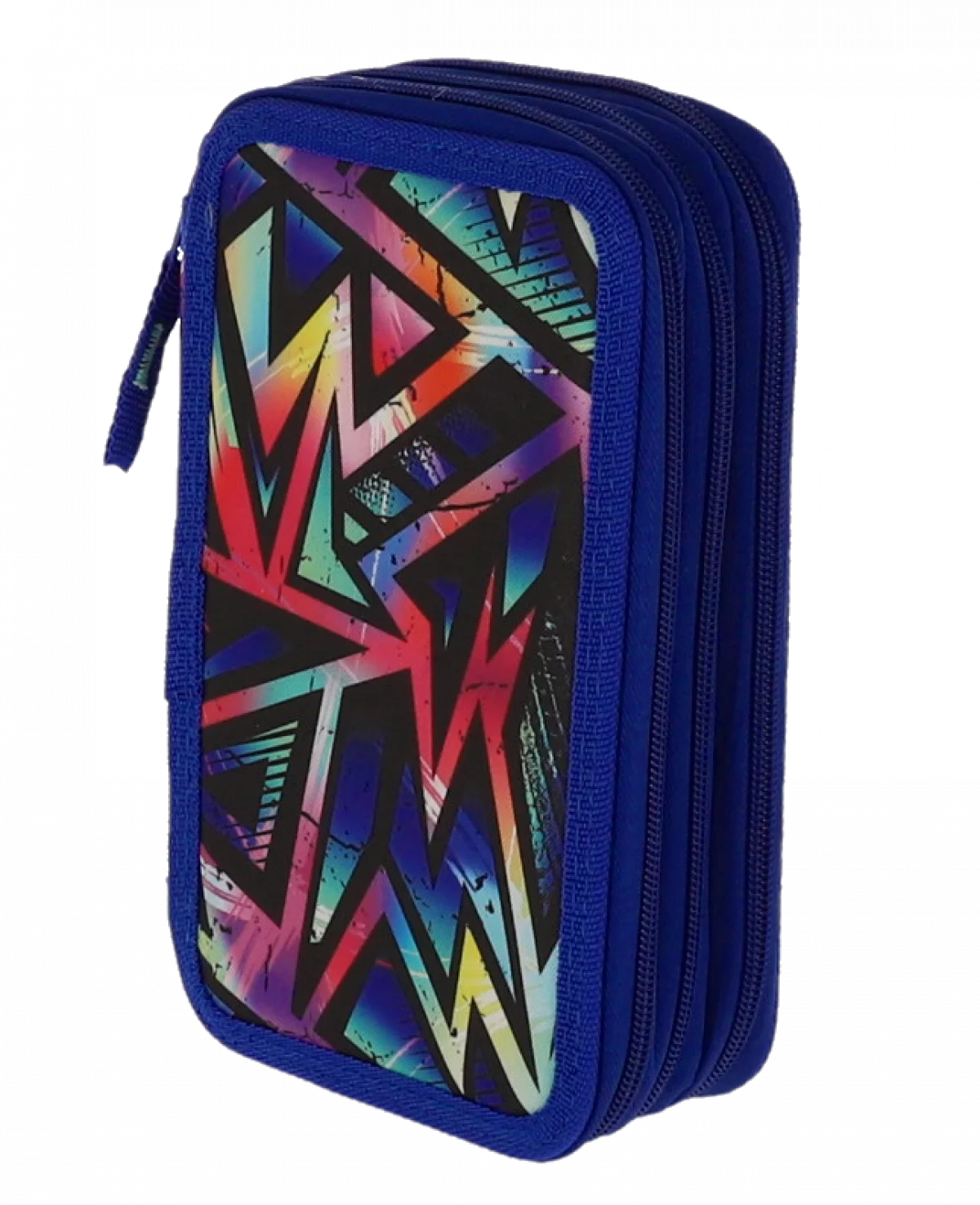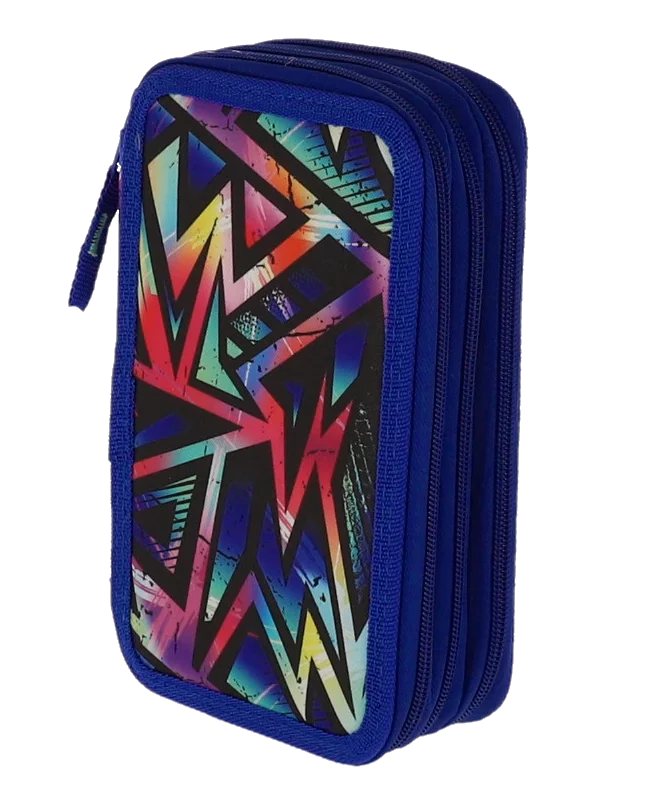 Penar școlar neechipat cu 3 compartimente cu fermoar, design geometric albastru modern. Ideal pentru organizarea eficientă a rechizitelor, confecționat din materiale rezistente cu imprimeu colorat de creioane și forme geometrice. Perfect pentru elevi și studenți.