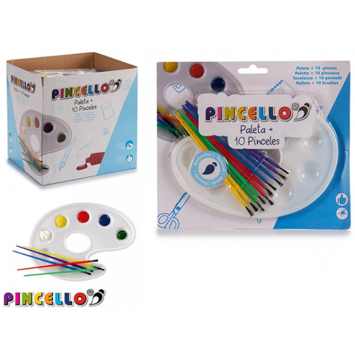 Setul Pincello include 10 pensule colorate cu mânere ergonomice și o paletă albă din plastic cu spații pentru amestecarea culorilor, perfect pentru pictura artistică și activități creative. Pensuletele au fire rezistente în nuanțe vibrante, ideale pentru acuarelă, tempera sau guașă, oferind copiilor și artiștilor amatori toate instrumentele necesare pentru a crea opere de artă.