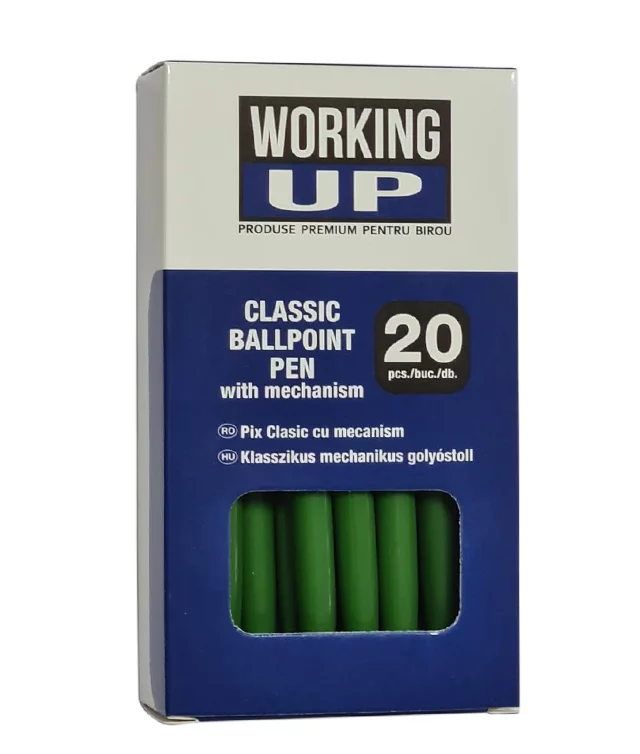 Pixul WUP Ballpoint Clasic cu mecanism verde oferă scriere fluidă și confort pentru uz zilnic la birou sau școală. Cu design ergonomic și corp verde vibrant, acest pix cu mecanism retractabil asigură durabilitate și ușurință în utilizare. Produs premium marca Working UP, ideal pentru note clare și precise.