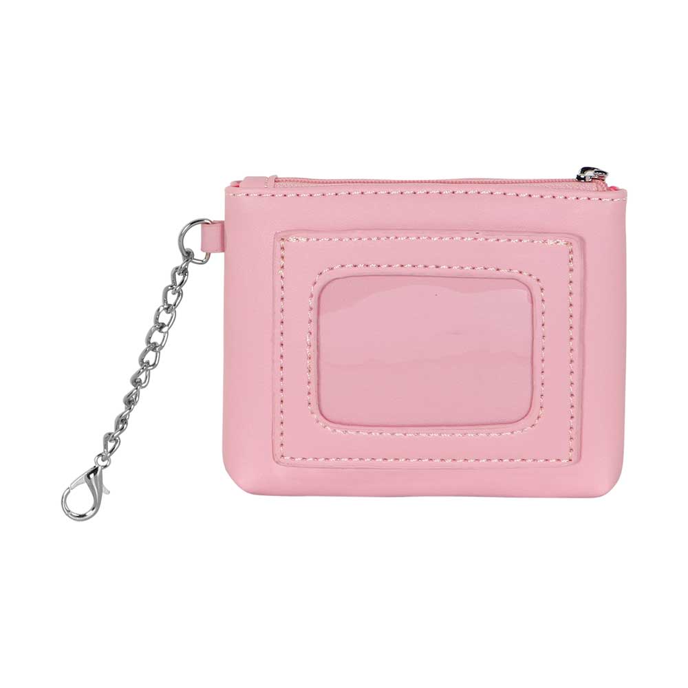 Portofel Barbie Travel cu monede si suport pentru carduri, roz. Compartiment frontal transparent si compartiment principal cu fermoar. Captuseala interioara. Lant lateral cu breloc. Dimensiuni: 9 x 11 x 1 cm.