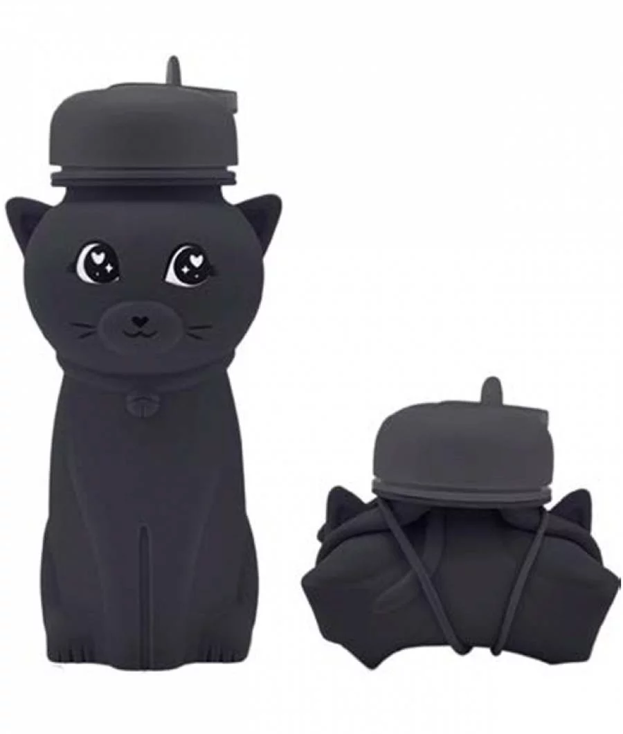 Sticlă de apă premium 500 ml cu husă din silicon în formă de pisică neagră adorabilă, cu capac cu pai retractabil. Design pliabil și compact, ideal pentru copii și adulți, ușor de transportat în geantă sau rucsac. Material ecologic, fără BPA, perfect pentru hidratare zilnică la școală sau în călătorii.