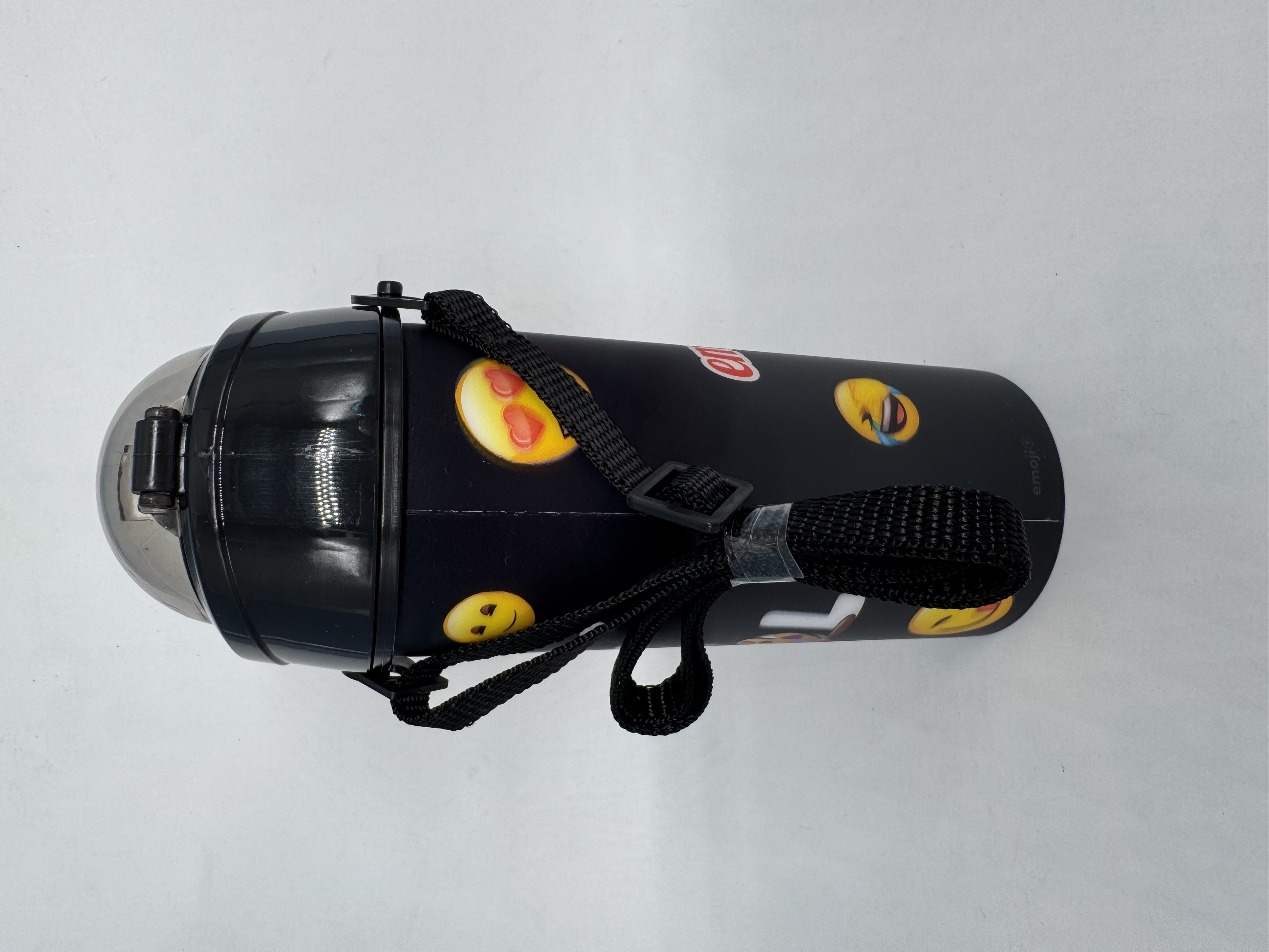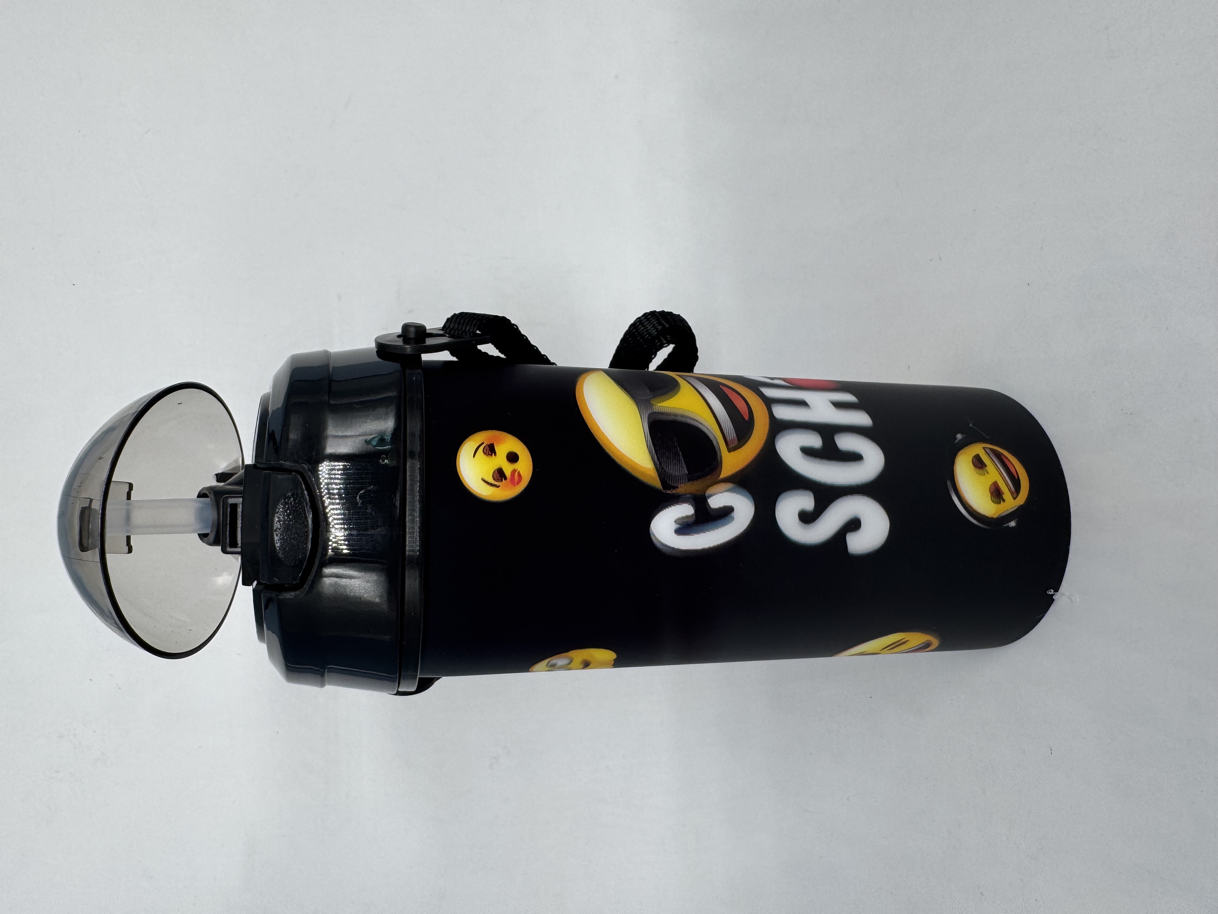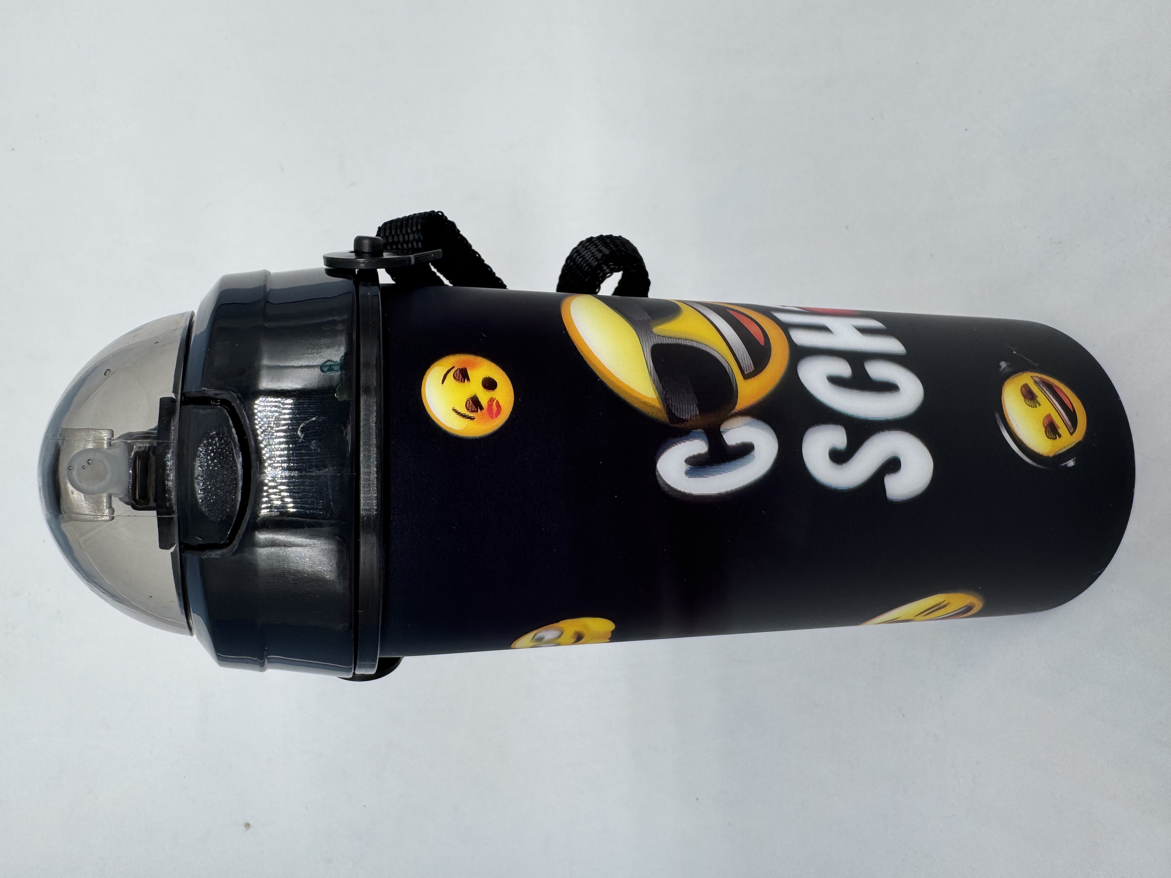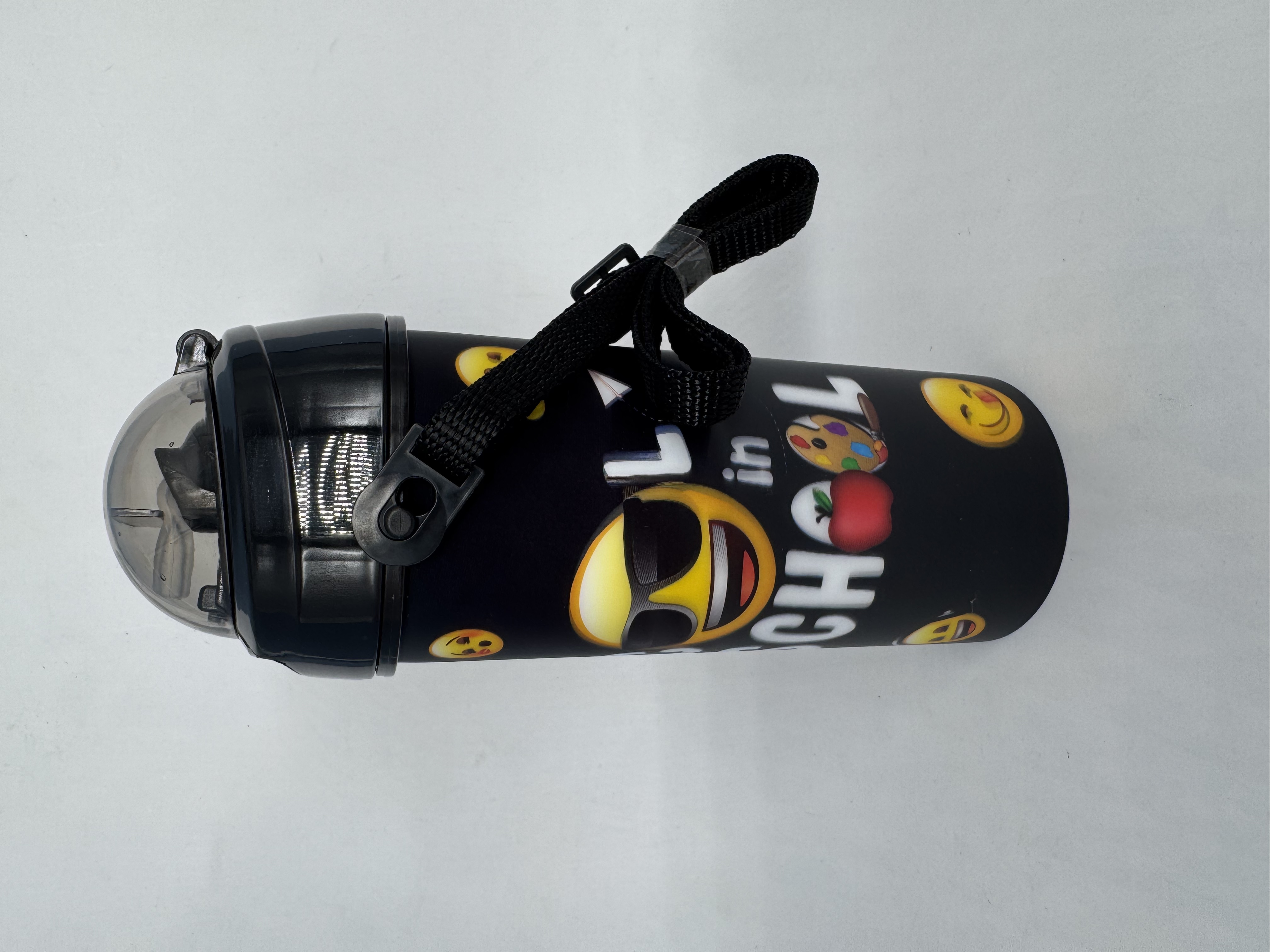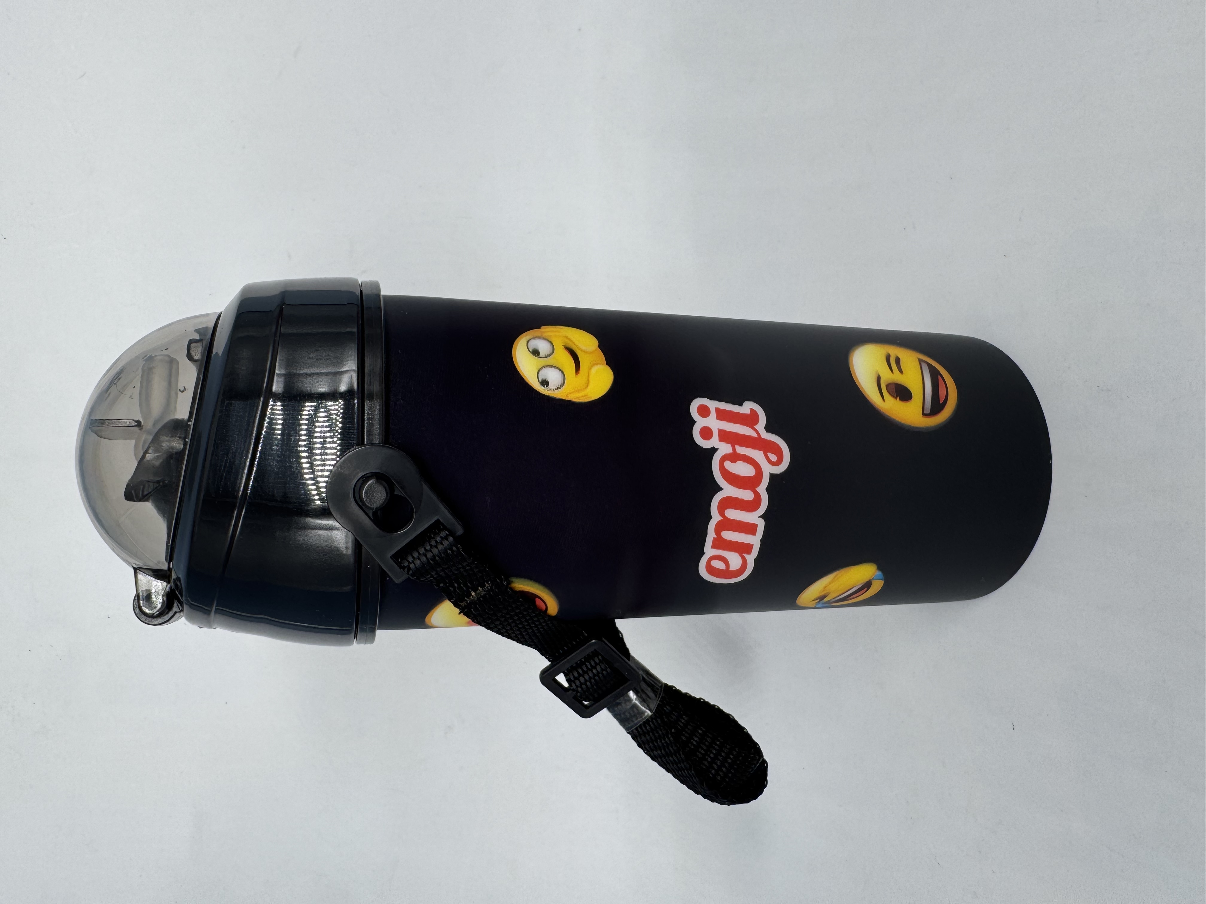 Sticlă pentru lichide de 600ml cu design emoji negru, perfectă pentru școală sau activități zilnice. Fabricată din materiale durabile, cu capac sigur și grafică emoji colorată pe fundal negru. Ideală pentru hidratare în deplasare, ușor de transportat și curățat.